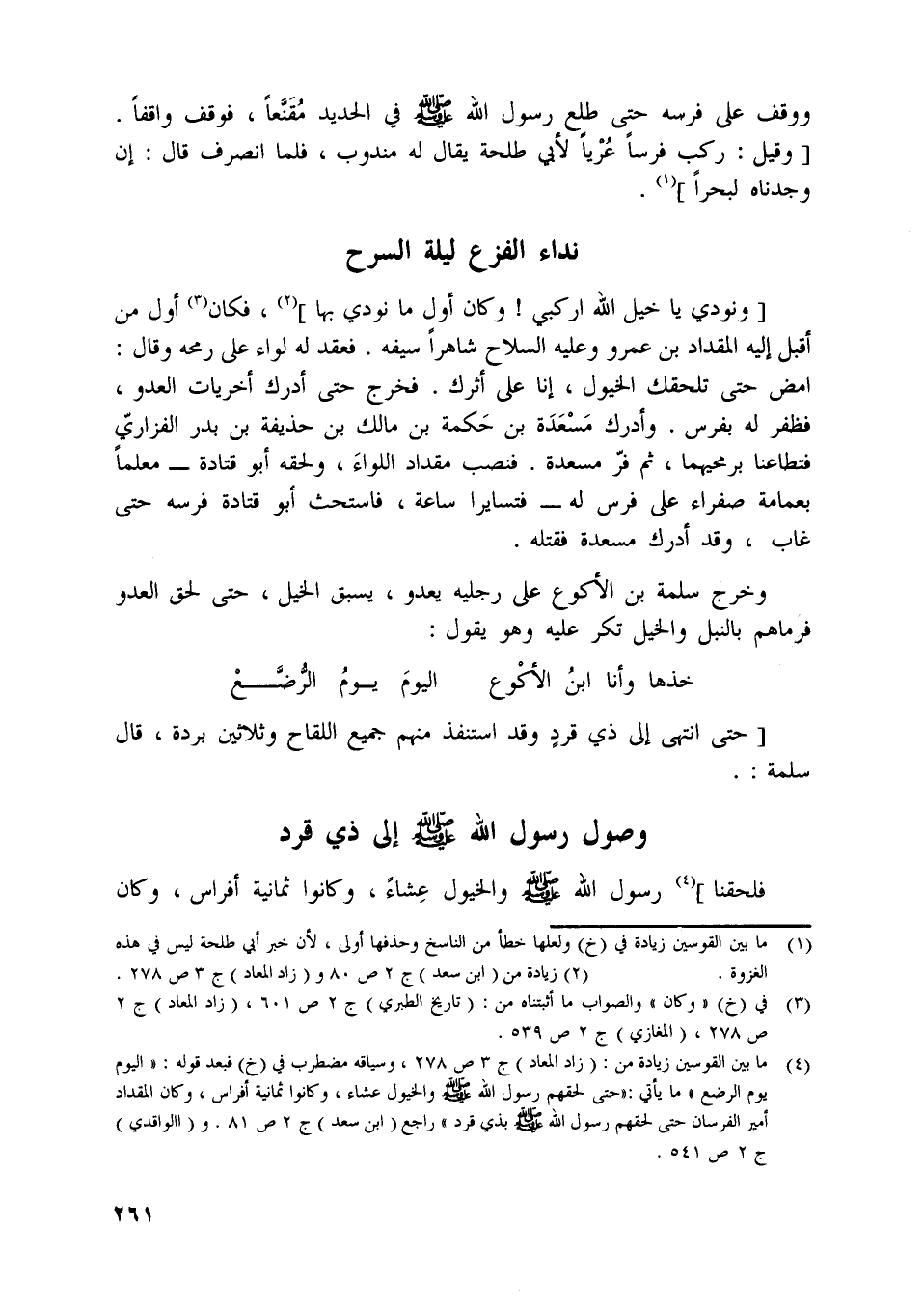 [ (4) ] ما بين القوسين زيادة من: (زاد المعاد) ج 3 ص 278، وسياقه مضطرب في (خ) فبعد قوله: «اليوم يوم الرضع» ما يأتي: «حتى لحقهم رسول اللَّه صلّى اللَّه عليه وسلّم والخيول عشاء، وكانوا ثمانية أفراس، وكان المقداد أمير الفرسان حتى لحقهم رسول اللَّه صلّى اللَّه عليه وسلّم بذي قرد» راجع (ابن سعد) ج 2 ص 81. و (الواقدي) ج 2 ص 541.