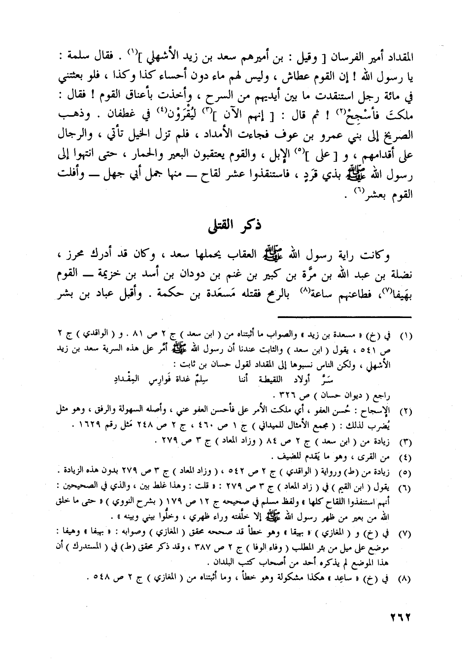 [ (1) ] في (خ) «مسعدة بن زيد» والصواب ما أثبتناه من (ابن سعد) ج 2 ص 81. و (الواقدي) ج 2 ص 541، يقول (ابن سعد) والثابت عندنا أن رسول اللَّه صلّى اللَّه عليه وسلّم أمّر على هذه السرية سعد بن زيد الأشهلي، ولكن الناس نسبوها إلى المقداد لقول حسان بن ثابت: