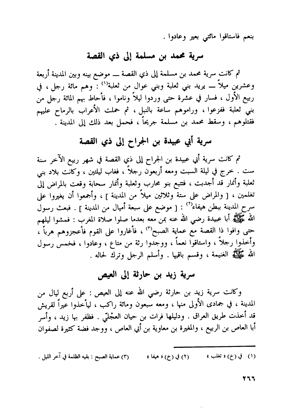 ثم كانت سرية محمد بن مسلمة إلى ذي القصة- موضع بينه وبين المدينة أربعة وعشرين ميلا- يريد بني ثعلبة وبني عوال من ثعلبة [ (1) ] : وهم مائة رجل، في ربيع الأول، فسار في عشرة حتى وردوا ليلا وناموا، فأحاط بهم المائة رجل من بني ثعلبة ففزعوا، وراموهم ساعة بالنبل، ثم حملت الأعراب بالرماح عليهم فقتلوهم، وسقط محمد بن مسلمة جريحا، فحمل بعد ذلك إلى المدينة.