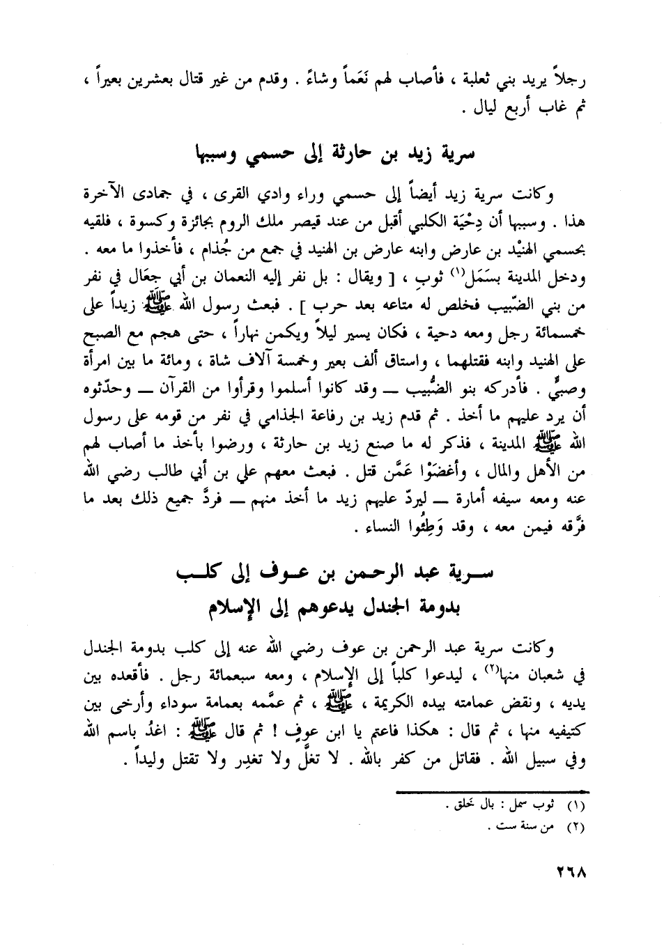 وكانت سرية عبد الرحمن بن عوف رضي اللَّه عنه إلى كلب بدومة الجندل في شعبان منها [ (2) ] ، ليدعوا كلبا إلى الإسلام، ومعه سبعمائة رجل. فأقعده بين يديه، ونقض عمامته بيده الكريمة، صلّى اللَّه عليه وسلّم، ثم عمّمه بعمامة سوداء وأرخى بين كتيفيه منها، ثم