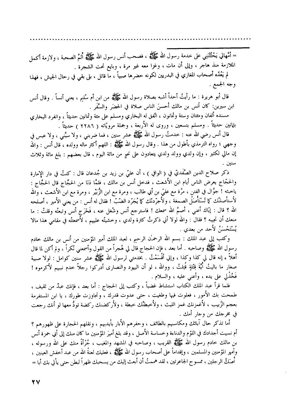 وكتب إلى عبد الملك: بسم اللَّه الرحمن الرحيم، لعبد الملك أمير المؤمنين من أنس بن مالك خادم رسول اللَّه صلّى اللَّه عليه وسلّم وصاحبه. أما بعد، فإن الحجاج قال لي هجرا من القول وأسمعني نكرا، ولم أكن لما قال أهلا، إنه قال لي كذا وكذا، وإني أقسمت. بخدمتي لرسول اللَّه صلّى اللَّه عليه وسلّم عشر سنين كوامل: لولا صبية صغار ما باليت أيّة قتلة قتلت، وو الله، لو أن اليهود والنصارى أدركوا رجلا خدم نبيهم لأكرموه! فخذ لي على يده، وأعني عليه، والسلام.