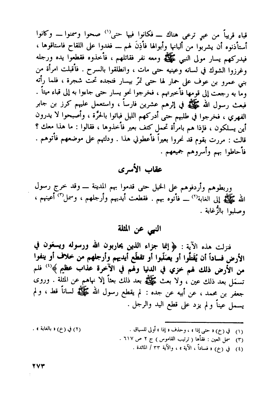وربطوهم وأردفوهم على الخيل حتى قدموا بهم المدينة- وقد خرج رسول اللَّه صلّى اللَّه عليه وسلّم إلى الغابة [ (2) ]- فأتوه بهم. فقطعت أيديهم وأرجلهم، وسمل [ (3) ] أعينهم، وصلبوا بالزّغابة.