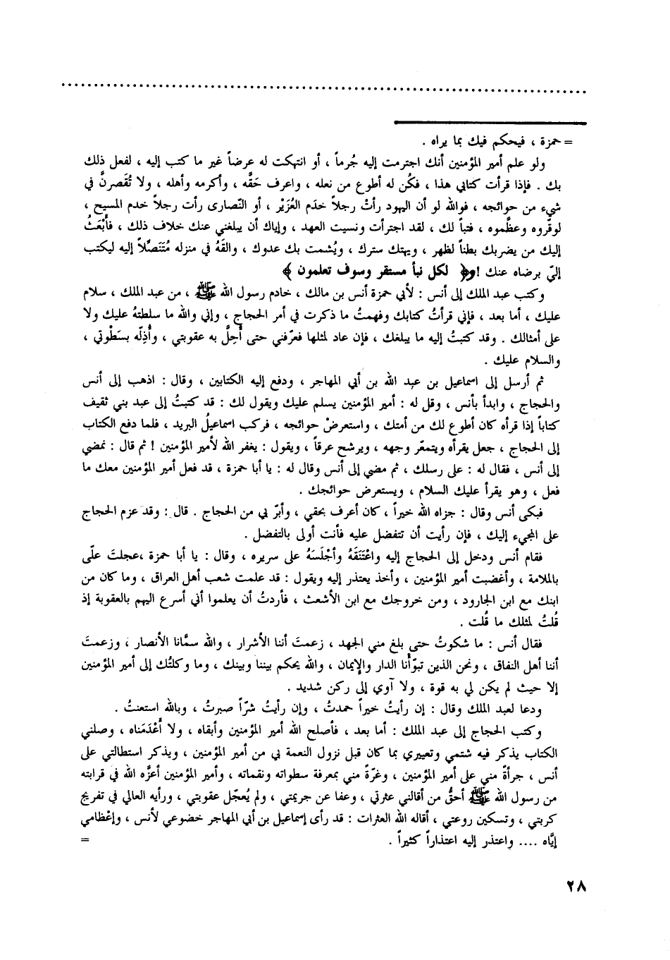ولو علم أمير المؤمنين أنك اجترمت إليه جرما، أو انتهكت له عرضا غير ما كتب إليه، لفعل ذلك بك. فإذا قرأت كتابي هذا، فكن له أطوع من نعله، واعرف حقّه، وأكرمه وأهله، ولا تقصرنّ في شيء من حوائجه، فو اللَّه لو أن اليهود رأت رجلا خدم العزير، أو النّصارى رأت رجلا خدم المسيح، لوقّروه وعظّموه، فتبا لك، لقد اجترأت ونسيت العهد، وإياك أن يبلغني عنك خلاف ذلك، فأبعث إليك من يضربك بطنا لظهر، ويهتك سترك، ويشمت بك عدوك، والقه في منزله متنصّلا إليه ليكتب إليّ برضاه عنك! ولِكُلِّ نَبَإٍ مُسْتَقَرٌّ وَسَوْفَ تَعْلَمُونَ وكتب عبد الملك إلى أنس: لأبي حمزة أنس بن مالك، خادم رسول اللَّه صلّى اللَّه عليه وسلّم، من عبد الملك، سلام عليك، أما بعد، فإنّي قرأت كتابك وفهمت ما ذكرت في أمر الحجاج، وإني واللَّه ما سلطته عليك ولا على أمثالك. وقد كتبت إليه ما يبلغك، فإن عاد لمثلها فعرّفني حتى أحلّ به عقوبتي، وأذلّه بسطوتي، والسلام عليك.