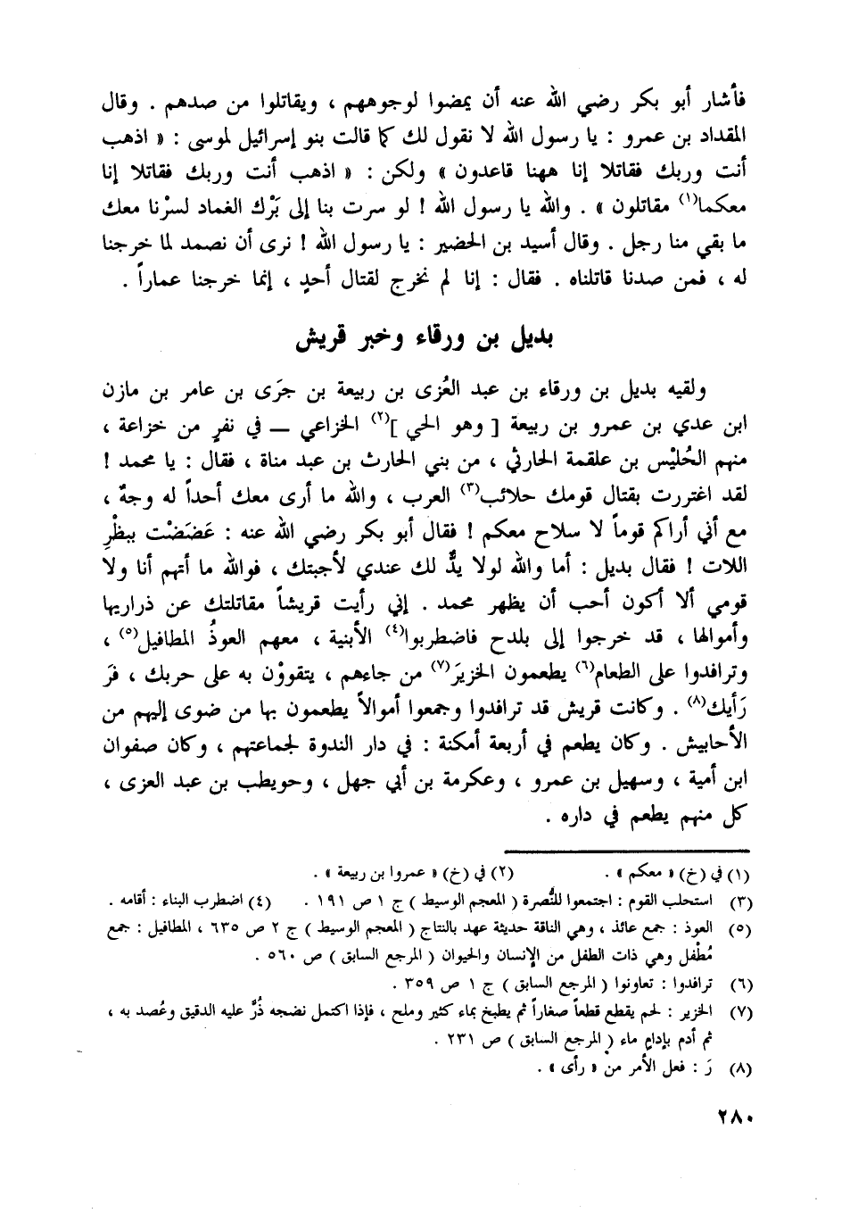 ولقيه بديل بن ورقاء بن عبد العزى بن ربيعة بن جرى بن عامر بن مازن ابن عدي بن عمرو بن ربيعة [وهو الحي] [ (2) ] الخزاعي- في نفر من خزاعة، منهم الحليس بن علقمة الحارثي، من بني الحارث بن عبد مناة، فقال: يا محمد! لقد اغتررت بقتال قومك حلائب [ (3) ] العرب، واللَّه ما أرى معك أحدا له وجه، مع أني أراكم قوما لا سلاح معكم! فقال أبو بكر رضي اللَّه عنه: عضضت ببظر اللات! فقال بديل: أما واللَّه لولا يد لك عندي لأجبتك، فو اللَّه ما أتهم أنا ولا قومي ألا أكون أحب أن يظهر محمد. إني رأيت قريشا مقاتلتك عن ذراريها وأموالها، قد خرجوا إلى بلدح فاضطربوا [ (4) ] الأبنية، معهم العوذ المطافيل [ (5) ] ، وترافدوا على الطعام [ (6) ] يطعمون الخزير [ (7) ] من جاءهم، يتقوون به على حربك، فر رأيك [ (8) ] . وكانت قريش قد ترافدوا وجمعوا أموالا يطعمون بها من ضوى إليهم من الأحابيش. وكان يطعم في أربعة أمكنة: في دار الندوة لجماعتهم، وكان صفوان ابن أمية، وسهيل بن عمرو، وعكرمة بن أبي جهل، وحويطب بن عبد العزى، كل منهم يطعم في داره.