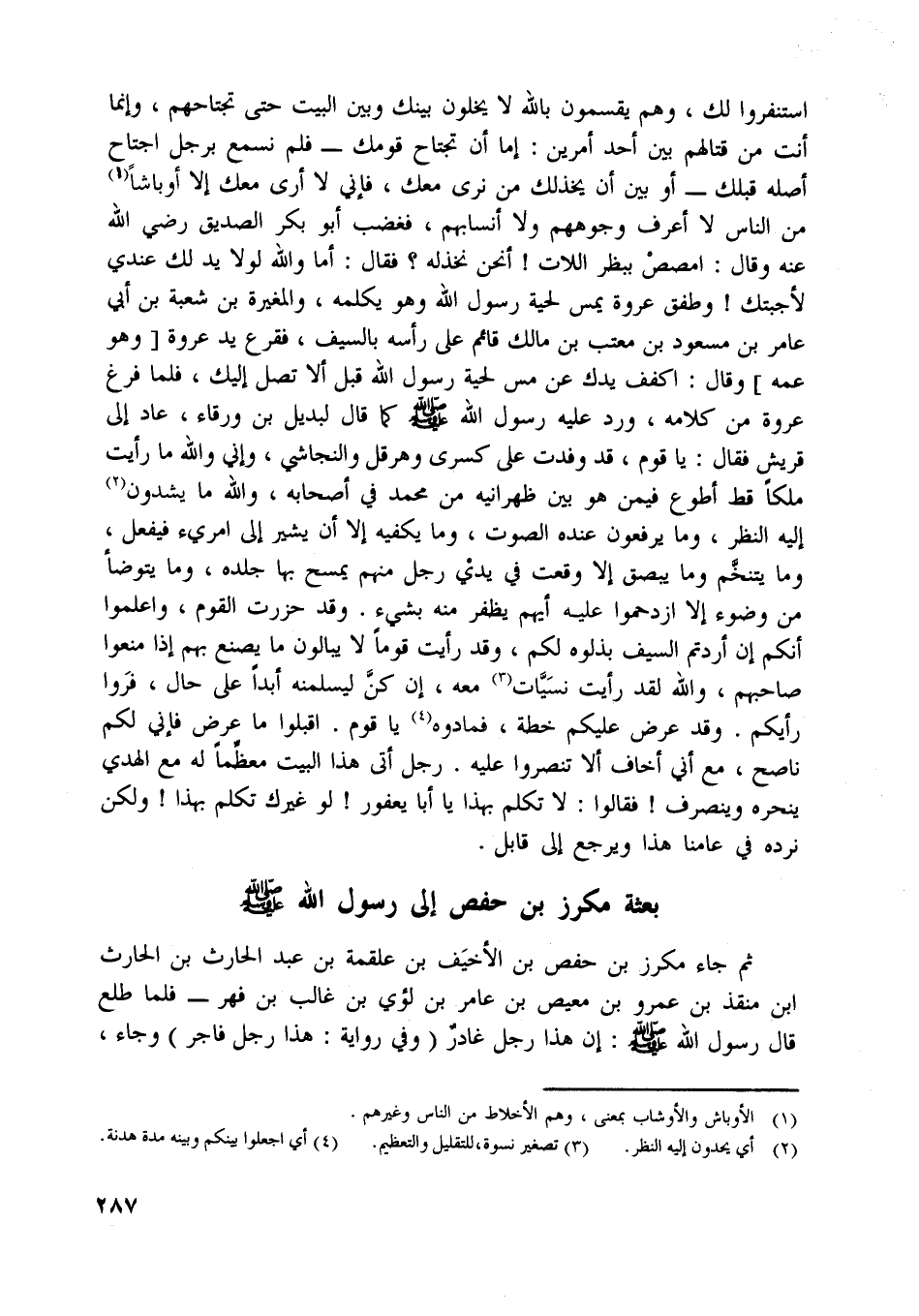 استنفروا لك، وهم يقسمون باللَّه لا يخلون بينك وبين البيت حتى تجتاحهم، وإنما أنت من قتالهم بين أحد أمرين: إما أن تجتاح قومك- فلم نسمع برجل اجتاح أصله قبلك- أو بين أن يخذلك من نرى معك، فإنّي لا أرى معك إلا أوباشا [ (1) ] من الناس لا أعرف وجوههم ولا أنسابهم، فغضب أبو بكر الصديق رضي اللَّه عنه وقال: امصص ببظر اللات! أنحن نخذله؟ فقال: أما واللَّه لولا يد لك عندي لأجبتك! وطفق عروة يمس لحية رسول اللَّه وهو يكلمه، والمغيرة بن شعبة بن أبي عامر بن مسعود بن معتب بن مالك قائم على رأسه بالسيف، فقرع يد عروة [وهو عمه] وقال: اكفف يدك عن مس لحية رسول اللَّه قبل ألا تصل إليك، فلما فرغ عروة من كلامه، ورد عليه رسول اللَّه صلّى اللَّه عليه وسلّم كما قال لبديل بن ورقاء، عاد إلى قريش فقال: يا قوم، قد وفدت على كسرى وهرقل والنجاشي، وإني واللَّه ما رأيت ملكا قط أطوع فيمن هو بين ظهرانيه من محمد في أصحابه، واللَّه ما يشدون [ (2) ] إليه النظر، وما يرفعون عنده الصوت، وما يكفيه إلا أن يشير إلى امرئ فيفعل، وما يتنخّم وما يبصق إلا وقعت في يدي رجل منهم يمسح بها جلده، وما يتوضأ من وضوء إلا ازدحموا عليه أيهم يظفر منه بشيء. وقد حزرت القوم، واعلموا أنكم إن أردتم السيف بذلوه لكم، وقد رأيت قوما لا يبالون ما يصنع بهم إذا منعوا صاحبهم، واللَّه لقد رأيت نسيّات [ (3) ] معه، إن كنّ ليسلمنه أبدا على حال، فروا رأيكم. وقد عرض عليكم خطة، فمادوه [ (4) ] يا قوم. أقبلوا ما عرض فإنّي لكم ناصح، مع أني أخاف ألا تنصروا عليه. رجل أتى هذا البيت معظّما له مع الهدي ينحره وينصرف! فقالوا: لا تكلم بهذا يا أبا يعفور! لو غيرك تكلم بهذا! ولكن نرده في عامنا هذا ويرجع إلى قابل.