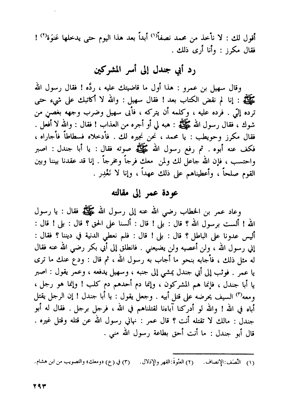 رفع رسول اللَّه صلّى اللَّه عليه وسلّم صوته فقال: يا أبا جندل: اصبر واحتسب، فإن اللَّه جاعل لك ولمن معك فرجا ومخرجا. إنا قد عقدنا بيننا وبين القوم صلحا، وأعطيناهم على ذلك عهدا، وإنا لا نغدر.