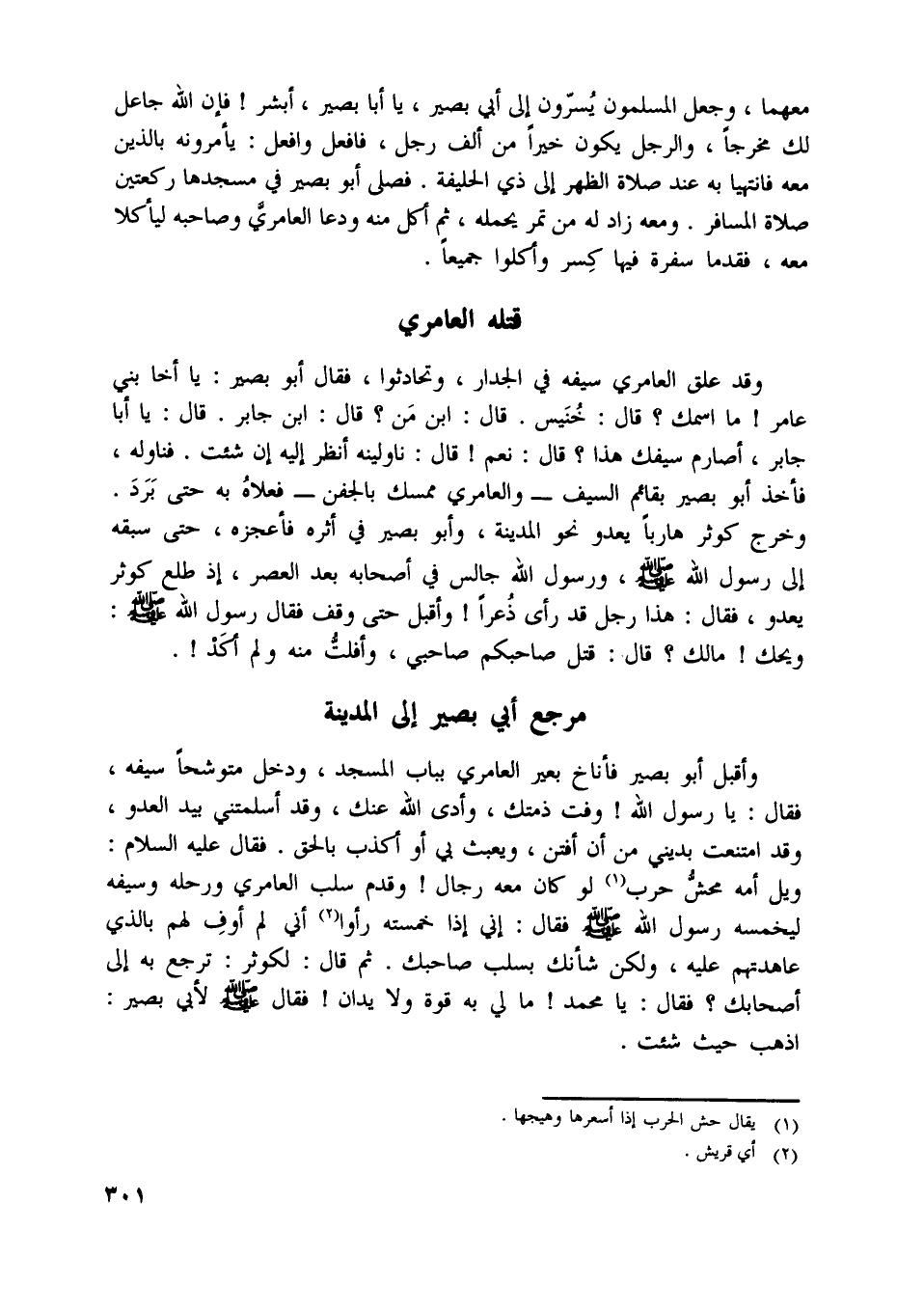 فقال عليه السلام: ويل أمه محشّ حرب [ (1) ] لو كان معه رجال! وقدم سلب العامري ورحله وسيفه ليخمسه رسول اللَّه صلّى اللَّه عليه وسلّم فقال: إني إذا خمسته رأوا [ (2) ] أني لم أوف لهم بالذي عاهدتهم عليه، ولكن شأنك بسلب صاحبك. ثم قال: لكوثر: ترجع به إلى أصحابك؟ فقال: يا محمد! ما لي به قوة ولا يدان! فقال صلّى اللَّه عليه وسلّم لأبي بصير: