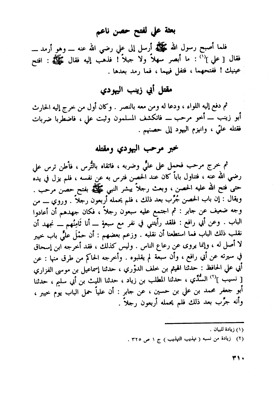 ويقال: إن باب الحصن جرّب بعد ذلك، فلم يحمله أربعون رجلا. وروي- من وجه ضعيف عن جابر: ثم اجتمع عليه سبعون رجلا، فكان جهدهم أن أعادوا الباب. وعن أبي رافع: فلقد رأيتني في نفر مع سبعة- أنا ثامنهم- نجهد أن نقلب ذلك الباب فما استطعنا أن نقلبه. وزعم بعضهم: أن حمل عليّ باب خيبر لا أصل له، وإنما يروى عن رعاع الناس. وليس كذلك، فقد أخرجه ابن إسحاق في سيرته عن أبي رافع، وأن سبعة لم يقلبوه. وأخرجه الحاكم من طرق منها: عن أبي علي الحافظ: حدثنا الهيثم بن خلف الدوري، حدثنا إسماعيل بن موسى الفزاري [نسيب] [ (2) ] السّدّي، حدثنا المطلب بن زياد، حدثنا الليث بن أبي سليم، حدثنا أبو جعفر محمد بن علي بن حسين، عن جابر: أن عليا حمل الباب يوم خيبر، وأنه جرّب بعد ذلك فلم يحمله أربعون رجلا.