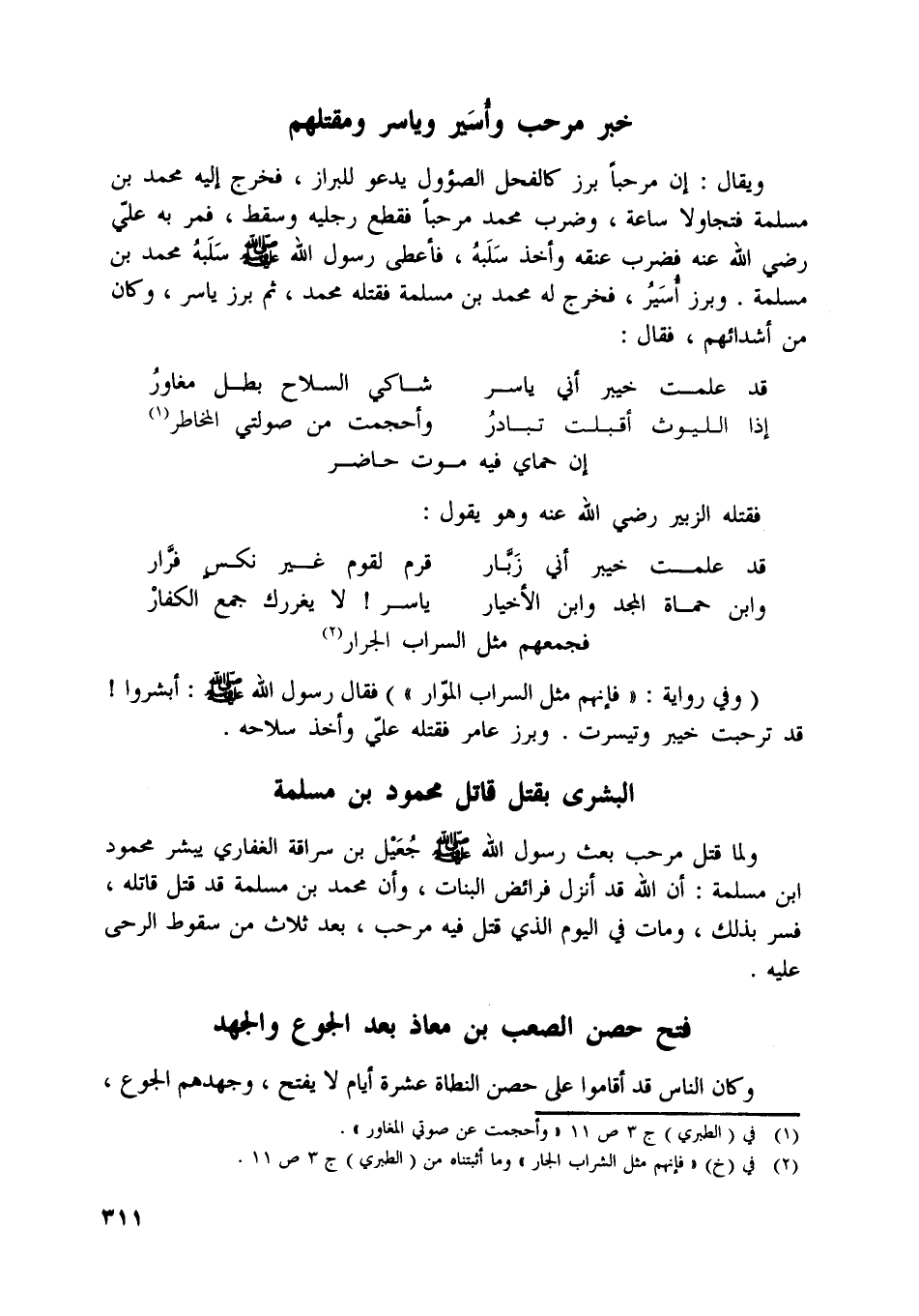 ويقال: إن مرحبا برز كالفحل الصئول يدعو للبراز، فخرج إليه محمد بن مسلمة فتجاولا ساعة، وضرب محمد مرحبا فقطع رجليه وسقط، فمر به عليّ رضي اللَّه عنه فضرب عنقه وأخذ سلبه، فأعطى رسول اللَّه صلّى اللَّه عليه وسلّم سلبه محمد بن مسلمة. وبرز أسير، فخرج له محمد بن مسلمة فقتله محمد، ثم برز ياسر، وكان من أشدائهم، فقال: