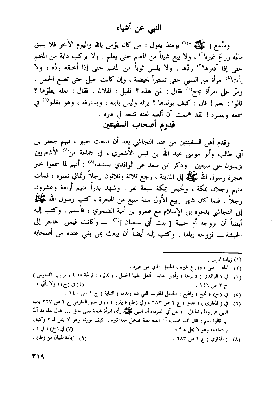 وسمع [صلّى اللَّه عليه وسلّم] [ (1) ] يومئذ يقول: من كان يؤمن باللَّه واليوم الآخر فلا يسق ماءه زرع غيره [ (2) ] ، ولا يبع شيئا من المغنم حتى يعلم. ولا يركب دابة من المغنم حتى إذا أدبرها [ (3) ] ردّها. ولا يلبس ثوبا من المغنم حتى إذا أخلقه ردّه، ولا يأت [ (4) ] امرأة من السبي حتى تستبرأ بحيضة، وإن كانت حبلى حتى تضع الحمل.