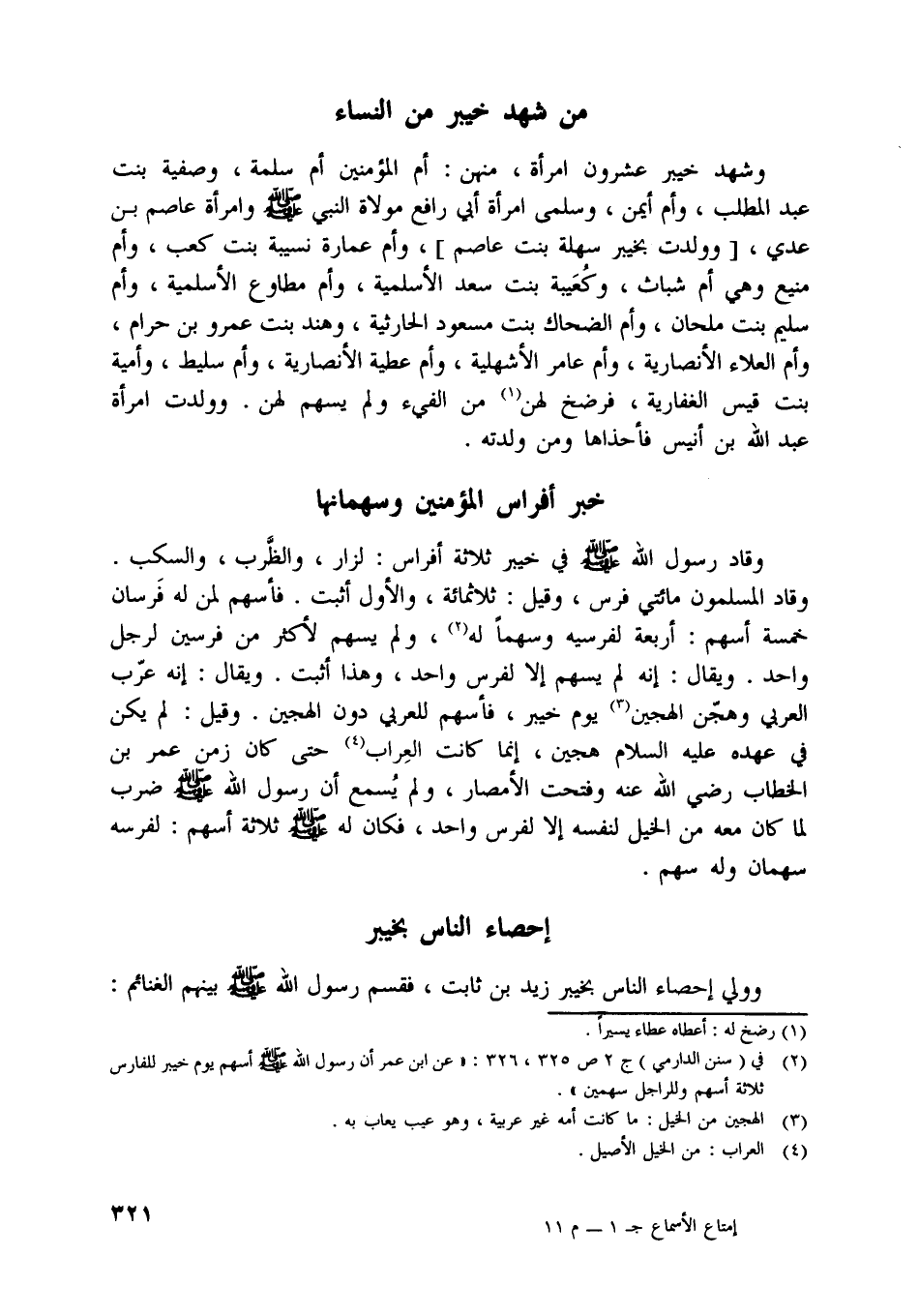 [ (2) ] في (سنن الدارميّ) ج 2 ص 325، 326: «عن ابن عمر أن رسول اللَّه صلّى اللَّه عليه وسلّم أسهم يوم خيبر للفارس ثلاثة أسهم وللراجل سهمين» .