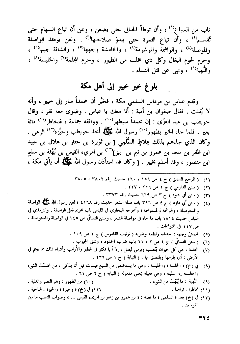 ناب من السباع [ (1) ] ، وأن توطأ الحبالى حتى يضعن، وعن أن تباع السهام حتى تقسم [ (2) ] ، وأن تباع الثمرة حتى يبدو صلاحها [ (3) ] . ولعن يومئذ الواصلة والموصلة [ (4) ] ، والواشمة والموشومة [ (4) ] ، والخامشة وجهها [ (5) ] ، والشاقة جيبها [ (6) ] ، وحرم لحوم البغال وكل ذي مخلب من الطيور، وحرم المجثّمة [ (7) ] والخليسة [ (8) ] ، والنّهبة [ (9) ] ، ونهى عن قتل النساء.