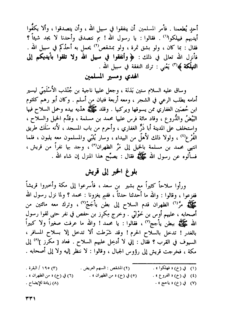 ورأوا سلاحا كثيرا مع بشير بن سعد، فأسرعوا إلى مكة وأخبروا قريشا ففزعوا، وقالوا: واللَّه ما أحدثنا حدثا، ففيم يغزونا: محمد؟ ولما نزل رسول اللَّه صلّى اللَّه عليه وسلّم مرّ [ (6) ] الظهران قدم السلاح إلى بطن يأجج [ (7) ] ، وترك معه مائتين من أصحابه، عليهم أوس بن خوليّ. وخرج مكرز بن حفص في نفر حتى لقوا رسول اللَّه صلّى اللَّه عليه وسلّم ببطن يأجج [ (7) ] ،