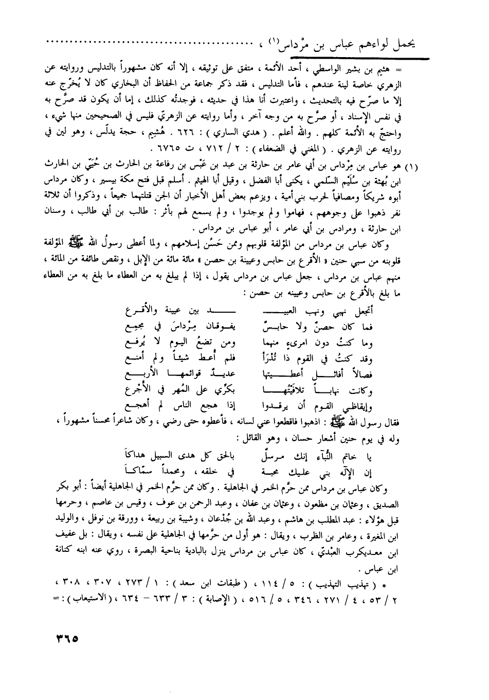 [ (1) ] هو عباس بن مرداس بن أبي عامر بن حارثة بن عبد بن عبس بن رفاعة بن الحارث بن حييّ بن الحارث ابن بهثة بن سليم السّلمي، يكنى أبا الفضل، وقيل أبا الهيثم. أسلم قبل فتح مكة بيسير، وكان مرداس أبوه شريكا ومصافيا لحرب بني أمية، ويزعم بعض أهل الأخبار أن الجن قتلتهما جميعا، وذكروا أن ثلاثة نفر ذهبوا على وجوههم، فهاموا ولم يوجدوا، ولم يسمع لهم بأثر: طالب بن أبي طالب، وسنان ابن حارثة، ومرداس بن أبي عامر، أبو عباس بن مرداس.