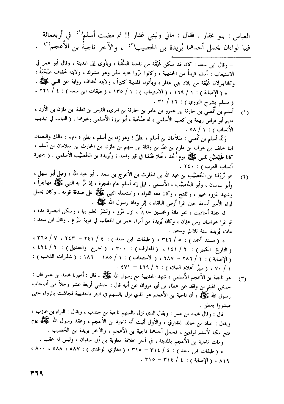 العباس: بنو غفار. فقال: ما لي ولبني غفار!! ثم مضت أسلم [ (1) ] في أربعمائة فيها لواءان يحمل أحدهما بريدة بن الحصيب [ (2) ] ، والآخر ناجية بن الأعجم [ (3) ] .