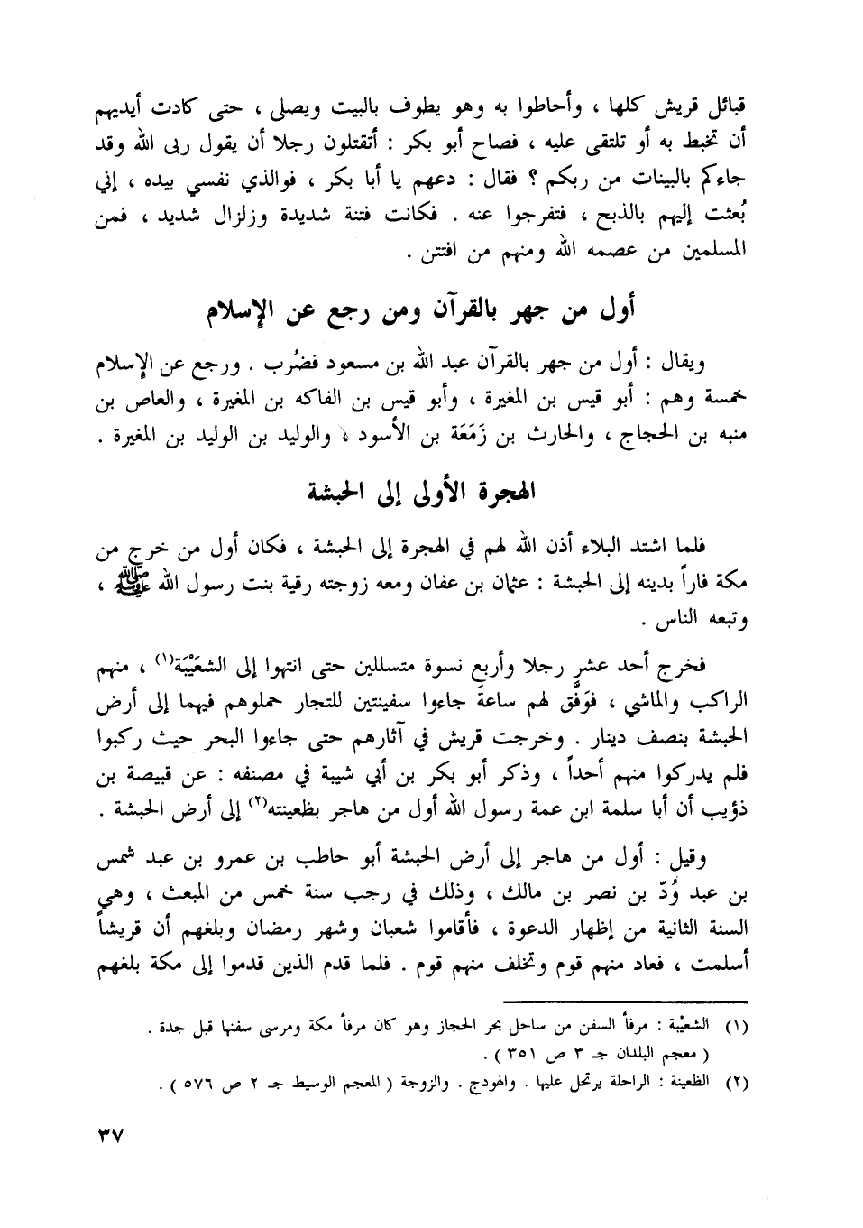 فخرج أحد عشر رجلا وأربع نسوة متسللين حتى انتهوا إلى الشعيبة [ (1) ] ، منهم الراكب والماشي، فوفّق لهم ساعة جاءوا سفينتين للتجار حملوهم فيهما إلى أرض الحبشة بنصف دينار. وخرجت قريش في آثارهم حتى جاءوا البحر حيث ركبوا فلم يدركوا منهم أحدا، وذكر أبو بكر بن أبي شيبة في مصنفه: عن قبيصة بن ذؤيب أن أبا سلمة ابن عمة رسول اللَّه أول من هاجر بظعينته [ (2) ] إلى أرض الحبشة.