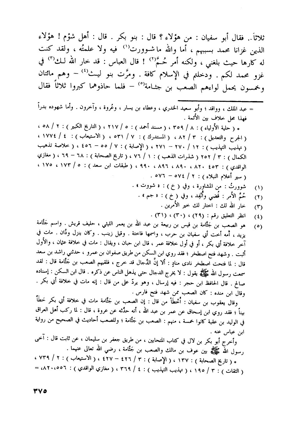 ثلاثا. فقال أبو سفيان: من هؤلاء؟ قال: بنو بكر. قال: أهل شؤم! هؤلاء الذين غزانا محمد بسببهم، أما واللَّه ما شوورت [ (1) ] فيه ولا علمته، ولقد كنت له كارها حيث بلغني، ولكنه أمر حمّ [ (2) ] ! قال العباس: قد خار اللَّه لك [ (3) ] في غزو محمد لكم. ودخلتم في الإسلام كافة. ومرّت بنو ليث [ (4) ]- وهم مائتان وخمسون يحمل لواءهم الصعب بن جثامة [ (5) ]- فلما حاذوهما كبروا ثلاثا فقال