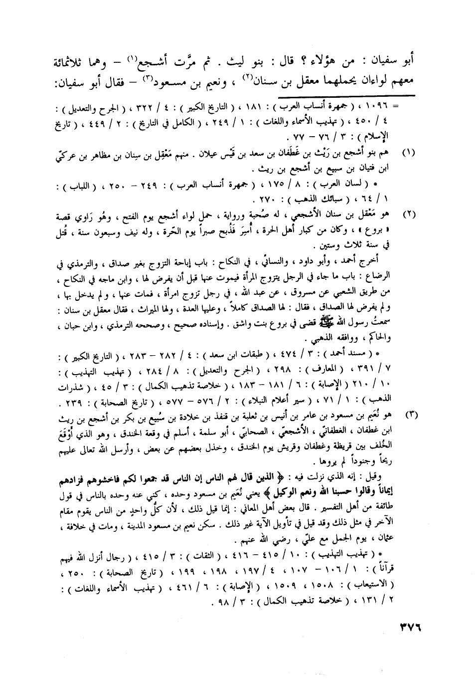 [ (3) ] هو نعيم بن مسعود بن عامر بن أنيس بن ثعلبة بن قنفذ بن خلادة بن سبيع بن بكر بن أشجع بن ريث ابن غطفان، الغطفانيّ، الأشجعيّ، الصحابيّ، أبو سلمة، أسلم في وقعة الخندق، وهو الّذي أوقع الخلف بين قريظة وغطفان وقريش يوم الخندق، وخذل بعضهم عن بعض، وأرسل اللَّه تعالى عليهم ريحا وجنودا لم يروها.