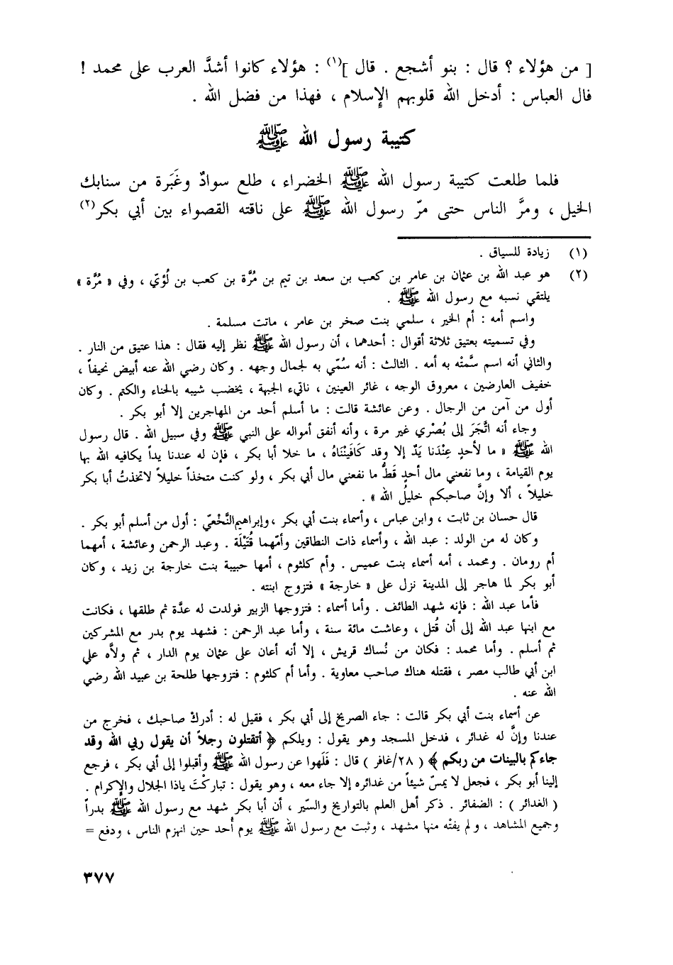فلما طلعت كتيبة رسول اللَّه صلّى اللَّه عليه وسلّم الخضراء، طلع سواد وغبرة من سنابك الخيل، ومرّ الناس حتى مرّ رسول اللَّه صلّى اللَّه عليه وسلّم على ناقته القصواء بين أبي بكر [ (2) ]