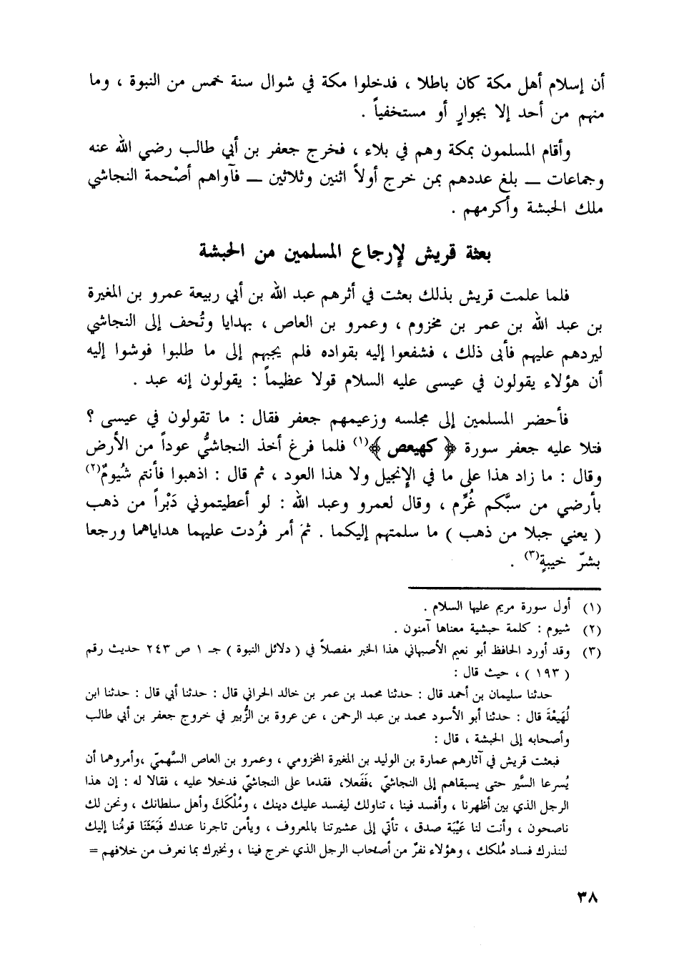 فتلا عليه جعفر سورة كهيعص [ (1) ] فلما فرغ أخذ النجاشيّ عودا من الأرض وقال: ما زاد هذا على ما في الإنجيل ولا هذا العود، ثم قال: اذهبوا فأنتم شيوم [ (2) ] بأرضي من سبّكم غرّم، وقال لعمرو وعبد اللَّه: لو أعطيتموني دبرا من ذهب (يعني جبلا من ذهب) ما سلمتهم إليكما. ثم أمر فردت عليهما هداياهما ورجعا بشرّ خيبة [ (3) ] .