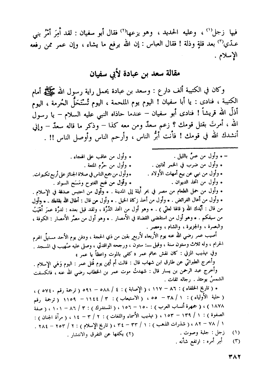 فيها زجل [ (1) ] ، وعليه الحديد، وهو يزعها [ (2) ] فقال أبو سفيان: لقد أمر أمر بني عدّي [ (3) ] بعد قلة وذلة! فقال العباس: إن اللَّه يرفع ما يشاء، وإن عمر ممن رفعه الإسلام.