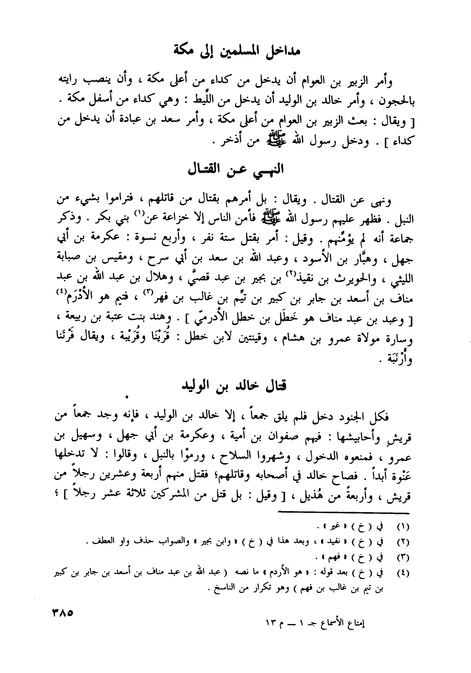 ونهى عن القتال. ويقال: بل أمرهم بقتال من قتالهم، فتراموا بشيء من النبل. فظهر عليهم رسول اللَّه صلّى اللَّه عليه وسلّم فأمن الناس إلا خزاعة عن [ (1) ] بني بكر. وذكر جماعة أنه لم يؤمّنهم. وقيل: أمر بقتل ستة نفر، وأربع نسوة: عكرمة بن أبي جهل، وهبّار بن الأسود، وعبد اللَّه بن سعد بن أبي سرح، ومقيس بن صبابة الليثي، والحويرث بن نقيذ [ (2) ] بن بجير بن عبد قصيّ، وهلال بن عبد اللَّه بن عبد مناف بن أسعد بن جابر بن كبير بن تيّم بن غالب بن فهر [ (3) ] ، فتيم هو الأدرم [ (4) ] [وعبد بن عبد مناف هو خطل بن خطل الأدرميّ] . وهند بنت عتبة بن ربيعة، وسارة مولاة عمرو بن هشام، وقينتين لابن خطل: قرينا وقريبة، ويقال فرتنا وأرنبة.