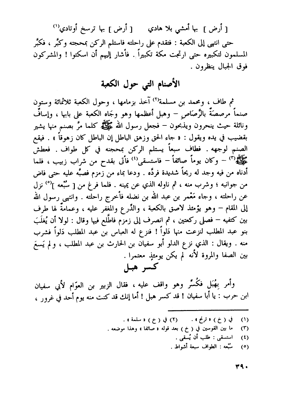 ثم طاف، ومحمد بن مسلمة [ (2) ] آخذ بزمامها، وحول الكعبة ثلاثمائة وستون صنما مرصصة بالرّصاص- وهبل أعظمها وهو وجاه الكعبة على بابها، وإساف ونائلة حيث ينحرون ويذبحون-