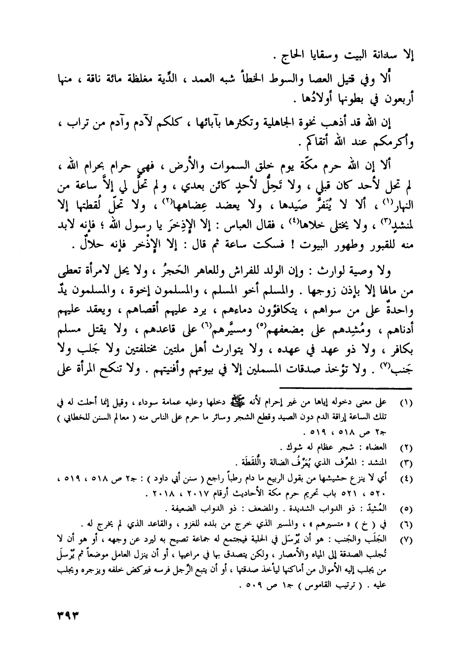 ولا وصية لوارث: وإن الولد للفراش وللعاهر الحجر، ولا يحل لامرأة تعطى من مالها إلا بإذن زوجها. والمسلم أخو المسلم، والمسلمون إخوة، والمسلمون يد واحدة على من سواهم، يتكافئون دماءهم، يرد عليهم أقصاهم، ويعقد عليهم أدناهم، ومشدهم على مضعفهم [ (5) ] ومسيّرهم [ (6) ] على قاعدهم، ولا يقتل مسلم بكافر، ولا ذو عهد في عهده، ولا يتوارث أهل ملتين مختلفتين ولا جلب ولا جنب [ (7) ] . ولا تؤخذ صدقات المسلمين إلا في بيوتهم وأفنيتهم. ولا تنكح المرأة على