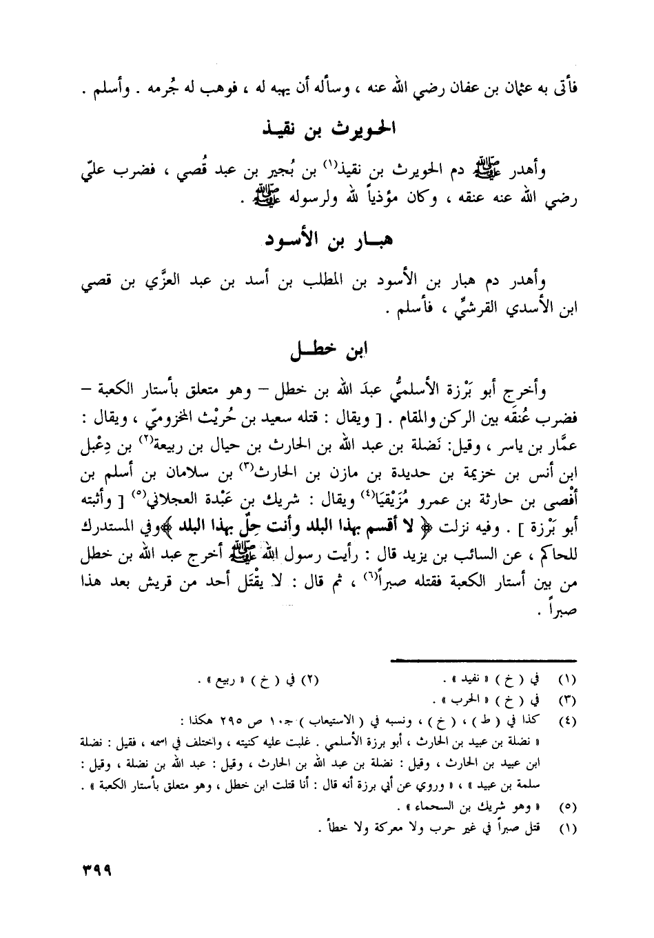 وفي المستدرك للحاكم، عن السائب بن يزيد قال: رأيت رسول اللَّه صلّى اللَّه عليه وسلّم أخرج عبد اللَّه بن خطل من بين أستار الكعبة فقتله صبرا [ (6) ] ، ثم قال: لا يقتل أحد من قريش بعد هذا صبرا.