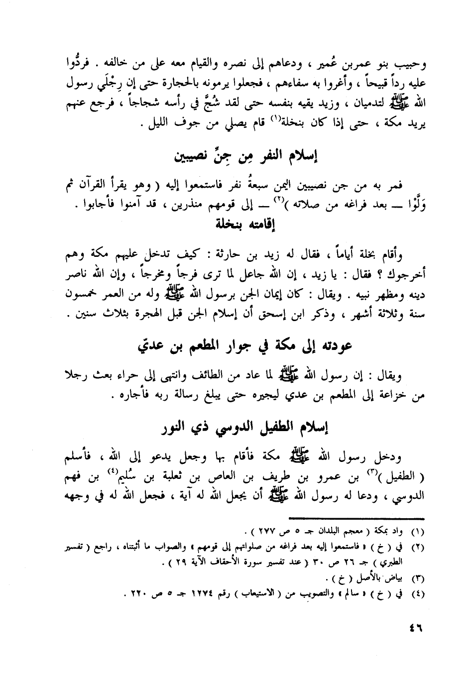 وحبيب بنو عمر بن عمير، ودعاهم إلى نصره والقيام معه على من خالفه. فردّوا عليه ردا قبيحا، وأغروا به سفاءهم، فجعلوا يرمونه بالحجارة حتى إن رجلي رسول اللَّه صلّى اللَّه عليه وسلّم لتدميان، وزيد يقيه بنفسه حتى لقد شجّ في رأسه شجاجا، فرجع عنهم يريد مكة، حتى إذا كان بنخلة [ (1) ] قام يصلي من جوف الليل.