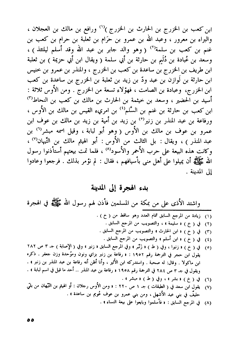 ابن كعب بن الخزرج بن الحارث بن الخزرج) [ (1) ] ورافع بن مالك بن العجلان، والبراء بن معرور، وعبد اللَّه بن عمرو بن حرام بن ثعلبة بن حرام بن كعب بن غنم بن كعب بن سلمة [ (2) ] (وهو والد جابر بن عبد اللَّه وقد أسلم ليلتئذ) ، وسعد بن عبادة بن دليم بن حارثة بن أبي سلمة (ويقال ابن أبي حزيمة) بن ثعلبة ابن طريف بن الخزرج بن ساعدة بن كعب بن الخزرج، والمنذر بن عمرو بن خنيس ابن حارثة بن لوازن بن عبد ودّ بن زيد بن ثعلبة بن الخزرج بن ساعدة بن كعب ابن الخزرج، وعبادة بن الصامت، فهؤلاء تسعة من الخزرج. ومن الأوس ثلاثة: