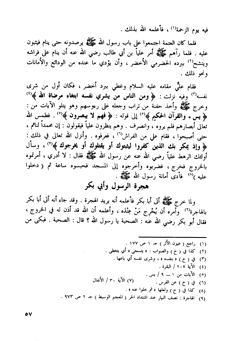 فقام عليّ مقامه عليه السلام وغطي ببرد أخضر، فكان أول من شرى نفسه [ (3) ] وفيه نزلت: وَمِنَ النَّاسِ مَنْ يَشْرِي نَفْسَهُ ابْتِغاءَ مَرْضاتِ اللَّهِ [ (4) ] وخرج صلّى اللَّه عليه وسلّم وأخذ حفنة من تراب وجعله على رءوسهم وهو يتلو الآيات من: