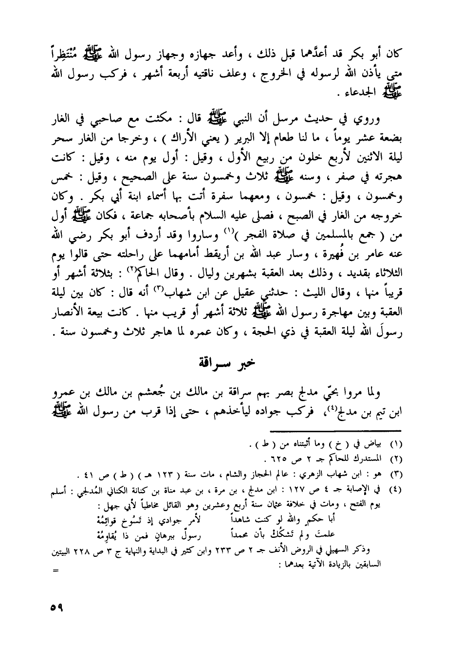 [ (4) ] في الإصابة ج 4 ص 127: ابن مدلج، بن مرة، بن عبد مناة بن كنانة الكناني المدلجي: أسلم يوم الفتح، ومات في خلافة عثمان سنة أربع وعشرين وهو القائل مخاطبا لأبي جهل: