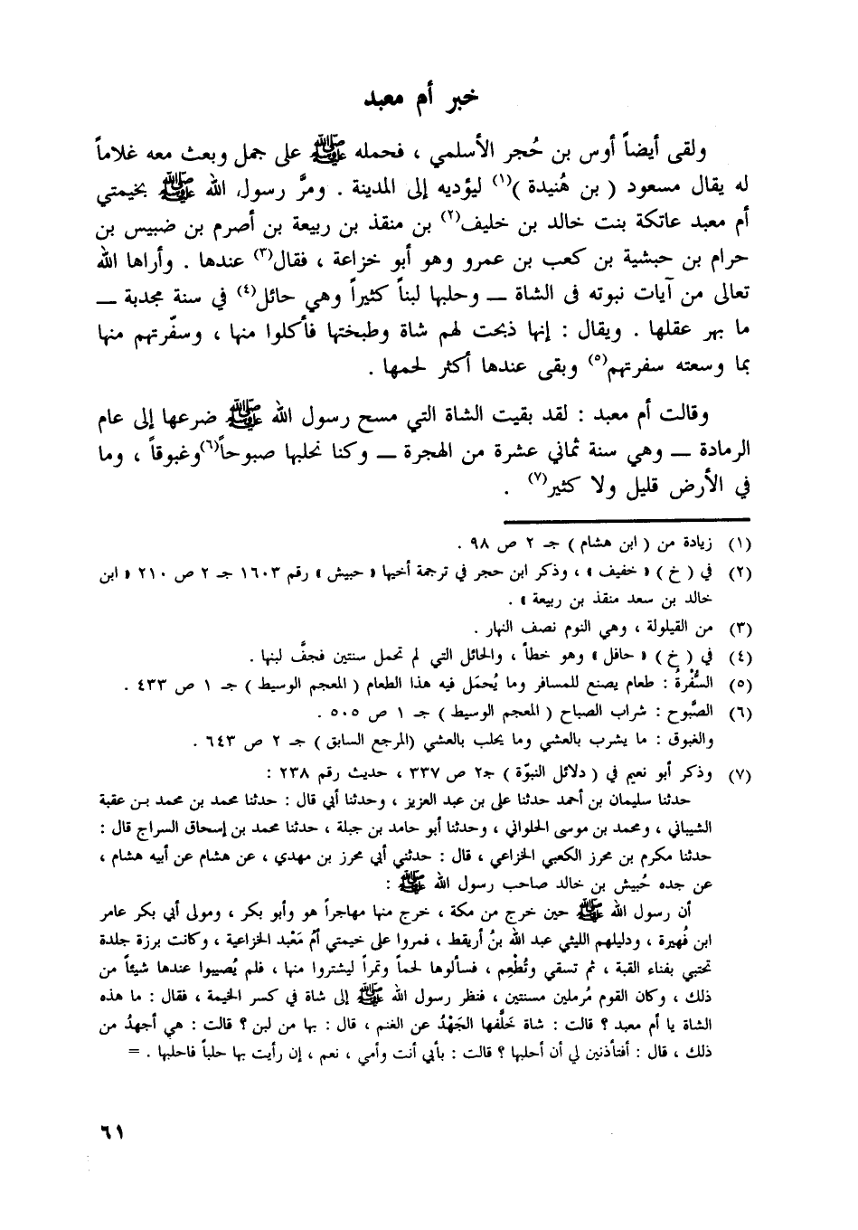 ولقي أيضا أوس بن حجر الأسلمي، فحمله صلّى اللَّه عليه وسلّم على جمل وبعث معه غلاما له يقال مسعود (بن هنيدة) [ (1) ] ليؤديه إلى المدينة. ومرّ رسول اللَّه صلّى اللَّه عليه وسلّم بخيمتي أم معبد عاتكة بنت خالد بن خليف [ (2) ] بن منقذ بن ربيعة بن أصرم بن ضبيس بن حرام بن حبشية بن كعب بن عمرو وهو أبو خزاعة، فقال [ (3) ] عندها. وأراها اللَّه تعالى من آيات نبوته في الشاة- وحلبها لبنا كثيرا وهي حائل [ (4) ] في سنة مجدبة- ما بهر عقلها. ويقال: إنها ذبحت لهم شاة وطبختها فأكلوا منها، وسفّرتهم منها بما وسعته سفرتهم [ (5) ] وبقي عندها أكثر لحمها.
