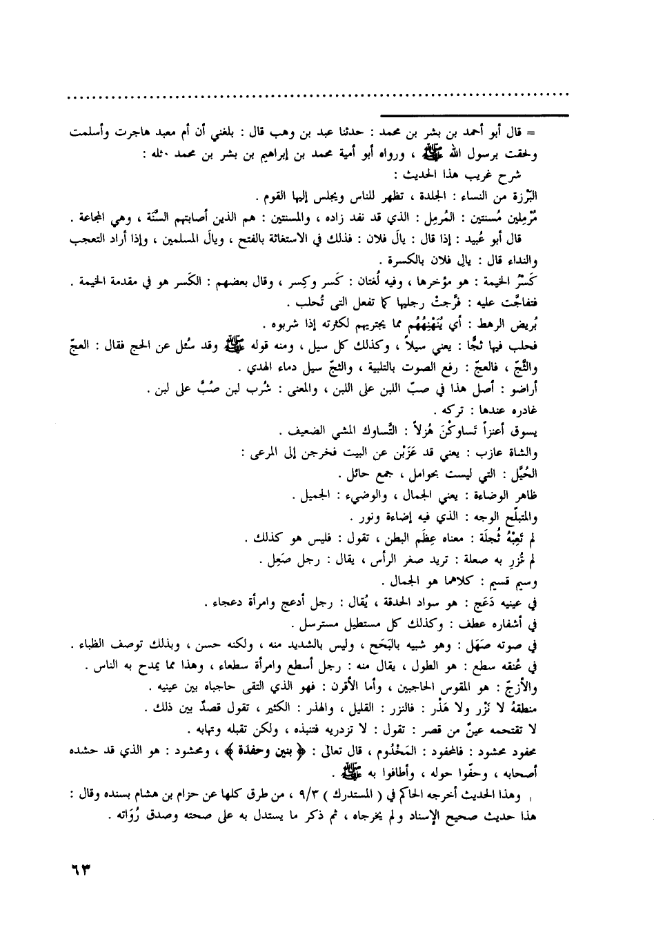 [ () ] قال أبو أحمد بن بشر بن محمد: حدثنا عبد بن وهب قال: بلغني أن أم معبد هاجرت وأسلمت ولحقت برسول اللَّه صلّى اللَّه عليه وسلّم، ورواه أبو أمية محمد بن إبراهيم بن بشر بن محمد مثله: