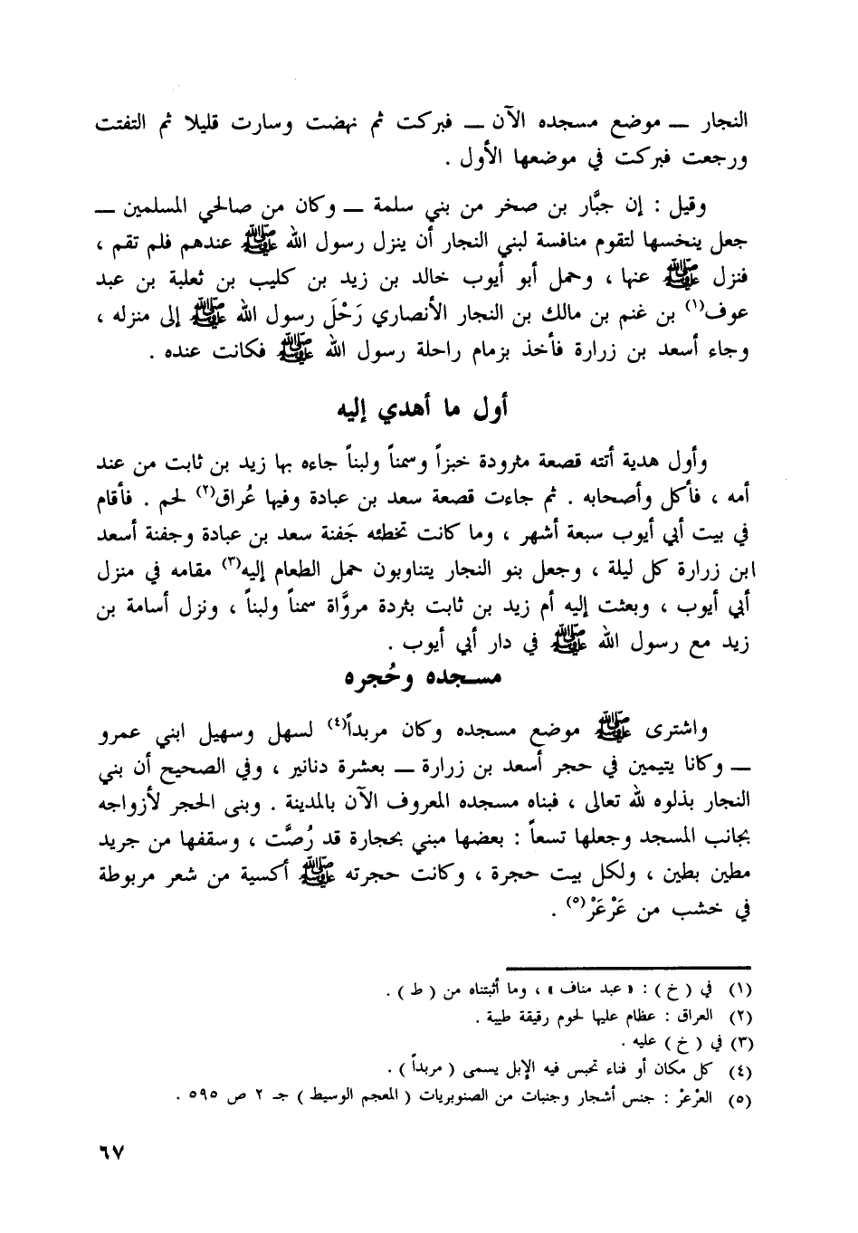 وأول هدية أتته قصعة مثرودة خبزا وسمنا ولبنا جاءه بها زيد بن ثابت من عند أمه، فأكل وأصحابه. ثم جاءت قصعة سعد بن عبادة وفيها عراق [ (2) ] لحم. فأقام في بيت أبي أيوب سبعة أشهر، وما كانت تخطئه جفنة سعد بن عبادة وجفنة أسعد ابن زرارة كل ليلة، وجعل بنو النجار يتناوبون حمل الطعام إليه [ (3) ] مقامه في منزل أبي أيوب، وبعثت إليه أم زيد بن ثابت بثردة مروّاة سمنا ولبنا، ونزل أسامة بن زيد مع رسول اللَّه صلّى اللَّه عليه وسلّم في دار أبي أيوب.