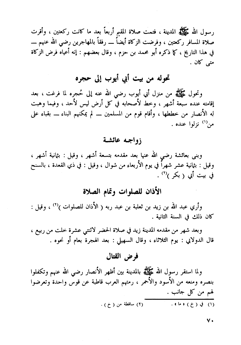 رسول اللَّه صلّى اللَّه عليه وسلّم المدينة، فتمت صلاة المقيم أربعا بعد ما كانت ركعتين، وأقرت صلاة المسافر ركعتين، وفرضت الزكاة أيضا- رفقا بالمهاجرين رضي اللَّه عنهم- في هذا التاريخ، كما ذكره أبو محمد بن حزم، وقال بعضهم: إنه أعياه فرض الزكاة متى كان.