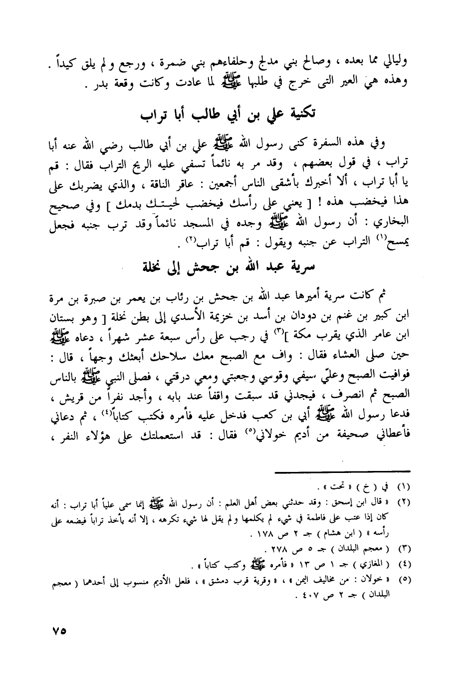 [ (2) ] «قال ابن إسحاق: وقد حدثني بعض أهل العلم: أن رسول اللَّه صلّى اللَّه عليه وسلّم إنما سمى عليا أبا تراب: أنه كان إذا عتب على فاطمة في شيء لم يكلمها ولم يقل لها شيء تكرهه، إلا أنه يأخذ ترابا فيضعه على رأسه» (ابن هشام) ج 2 ص 178.