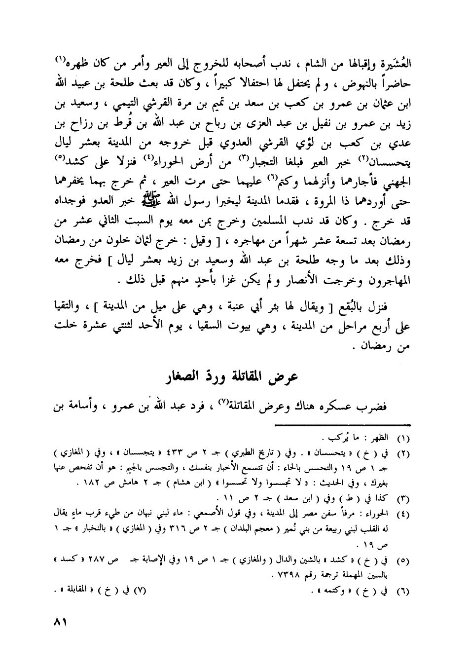 العشيرة وإقبالها من الشام، ندب أصحابه للخروج إلى العير وأمر من كان ظهره [ (1) ] حاضرا بالنهوض، ولم يحتفل لها احتفالا كبيرا، وكان قد بعث طلحة بن عبيد اللَّه ابن عثمان بن عمرو بن كعب بن سعد بن تميم بن مرة القرشي التيمي، وسعيد بن زيد بن عمرو بن نفيل بن عبد العزى بن رباح بن عبد اللَّه بن قرط بن رزاح بن عدي بن كعب بن لؤيّ القرشي العدوي قبل خروجه من المدينة بعشر ليال يتحسسان [ (2) ] خبر العير فبلغا التجبار [ (3) ] من أرض الحوراء [ (4) ] فنزلا على كشد [ (5) ] الجهنيّ فأجارهما وأنزلهما وكتم [ (6) ] عليهما حتى مرت العير، ثم خرج بهما يخفرهما حتى أوردهما ذا المروة، فقدما المدينة ليخبرا رسول اللَّه صلّى اللَّه عليه وسلّم خبر العدو فوجداه قد خرج. وكان قد ندب المسلمين وخرج بمن معه يوم السبت الثاني عشر من رمضان بعد تسعة عشر شهرا من مهاجره، [وقيل: خرج لثمان خلون من رمضان وذلك بعد ما وجه طلحة بن عبد اللَّه وسعيد بن زيد بعشر ليال] فخرج معه المهاجرون وخرجت الأنصار ولم يكن غزا بأحد منهم قبل ذلك.