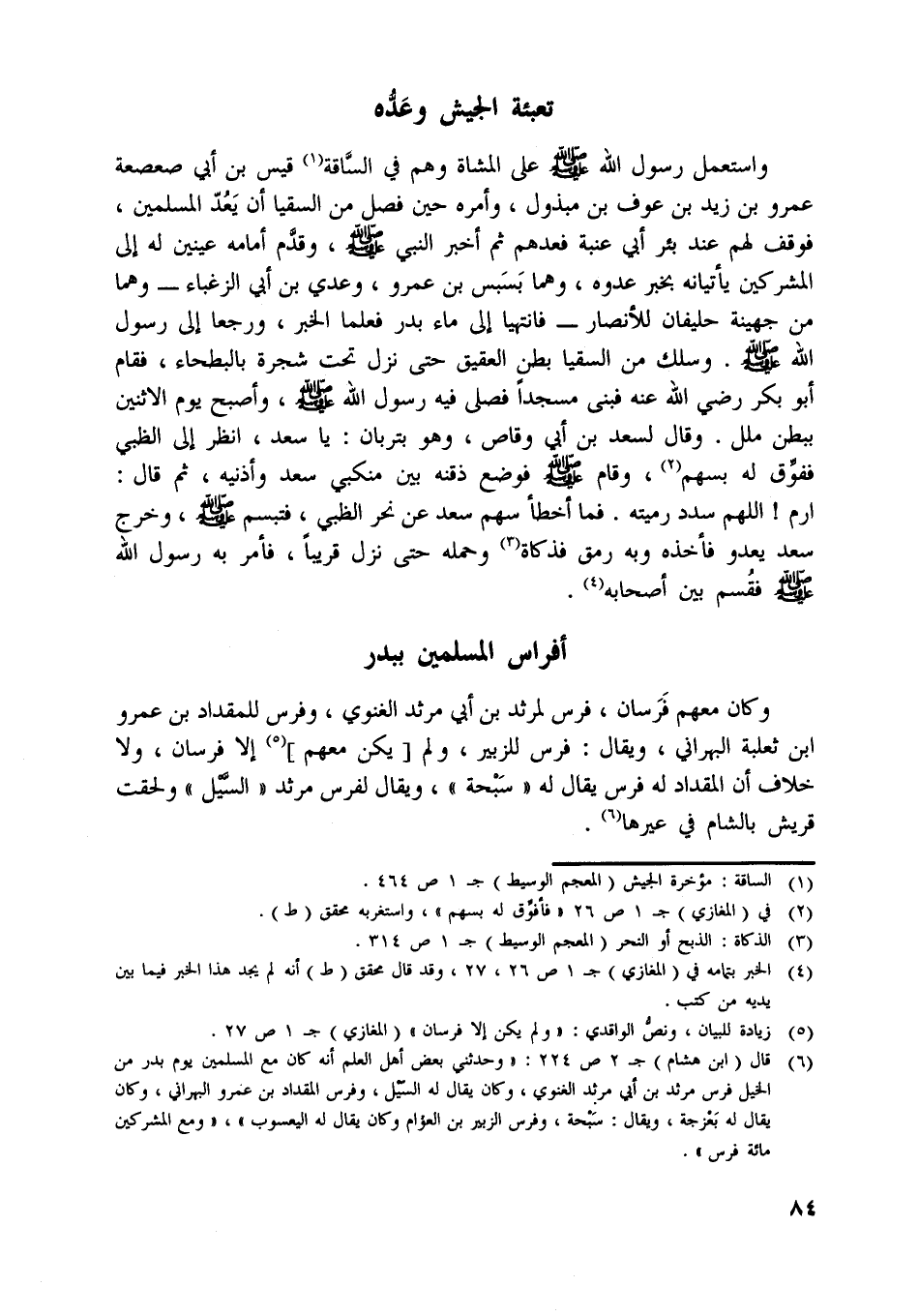 [ (6) ] قال (ابن هشام) ج 2 ص 224: «وحدثني بعض أهل العلم أنه كان مع المسلمين يوم بدر من الخيل فرس مرثد بن أبي مرثد الغنوي، وكان يقال له السّيل، وفرس المقداد بن عمرو البهراني، وكان يقال له بعزجة، ويقال: سبحة، وفرس الزبير بن العوام وكان يقال له اليعسوب» ، «ومع المشركين مائة فرس» .