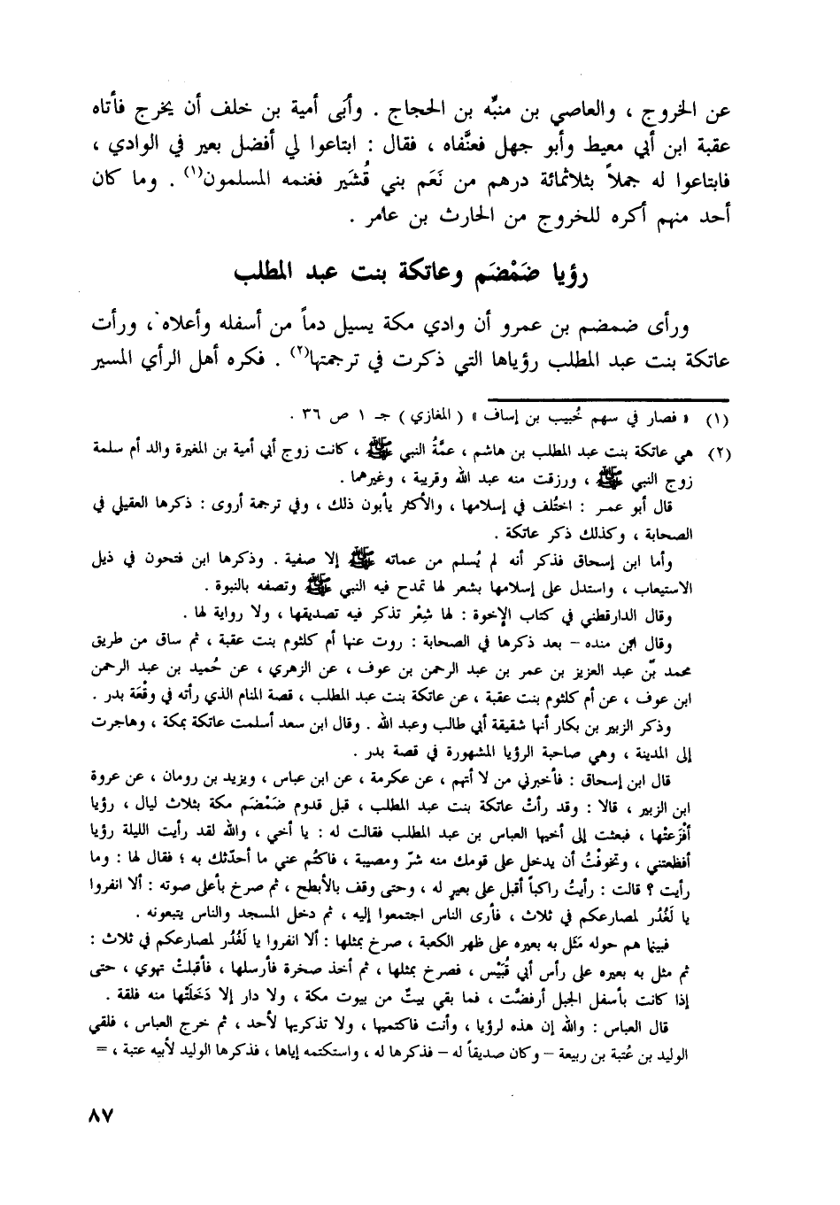 ورأى ضمضم بن عمرو أن وادي مكة يسيل دما من أسفله وأعلاه، ورأت عاتكة بنت عبد المطلب رؤياها التي ذكرت في ترجمتها [ (2) ] . فكره أهل الرأي المسير