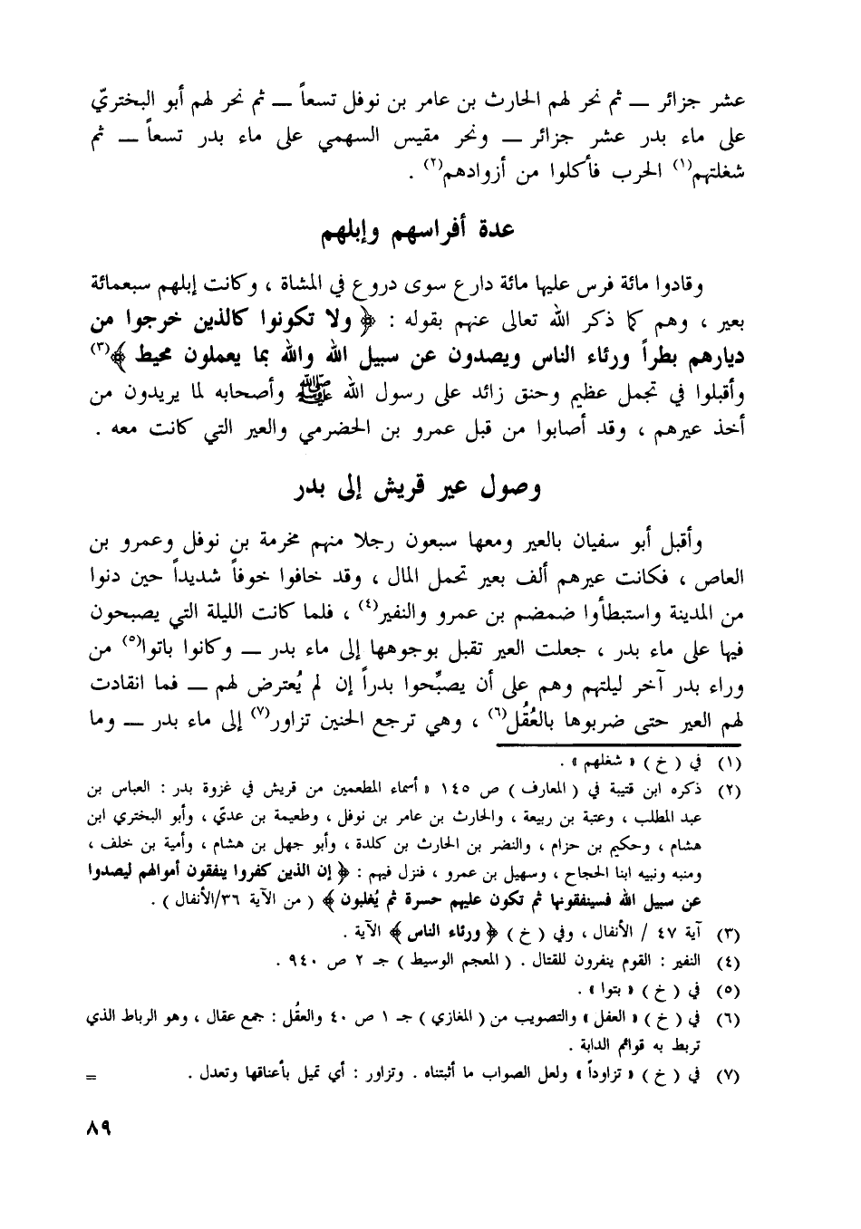 [ (2) ] ذكره ابن قتيبة في (المعارف) ص 145 «أسماء المطعمين من قريش في غزوة بدر: العباس بن عبد المطلب، وعتبة بن ربيعة، والحارث بن عامر بن نوفل، وطعيمة بن عديّ، وأبو البختري ابن هشام، وحكيم بن حزام، والنضر بن الحارث بن كلدة، وأبو جهل بن هشام، وأمية بن خلف، ومنبه ونبيه ابنا الحجاج، وسهيل بن عمرو، فنزل فيهم: إِنَّ الَّذِينَ كَفَرُوا يُنْفِقُونَ أَمْوالَهُمْ لِيَصُدُّوا عَنْ سَبِيلِ اللَّهِ فَسَيُنْفِقُونَها ثُمَّ تَكُونُ عَلَيْهِمْ حَسْرَةً ثُمَّ يُغْلَبُونَ (من الآية 36/ الأنفال) .