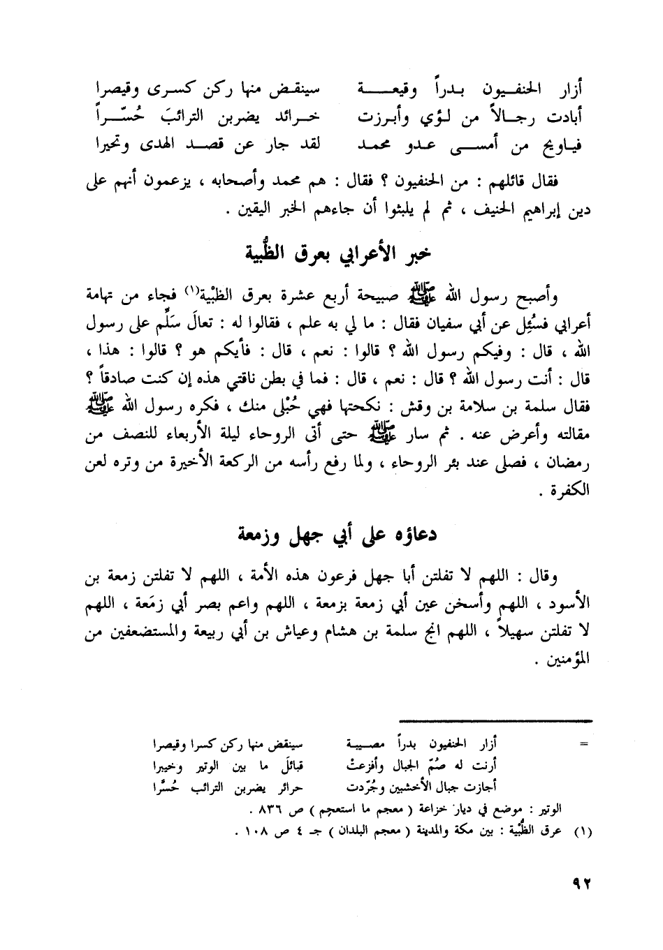 فقال قائلهم: من الحنفيون؟ فقال: هم محمد وأصحابه، يزعمون أنهم على دين إبراهيم الحنيف، ثم لم يلبثوا أن جاءهم الخبر اليقين.