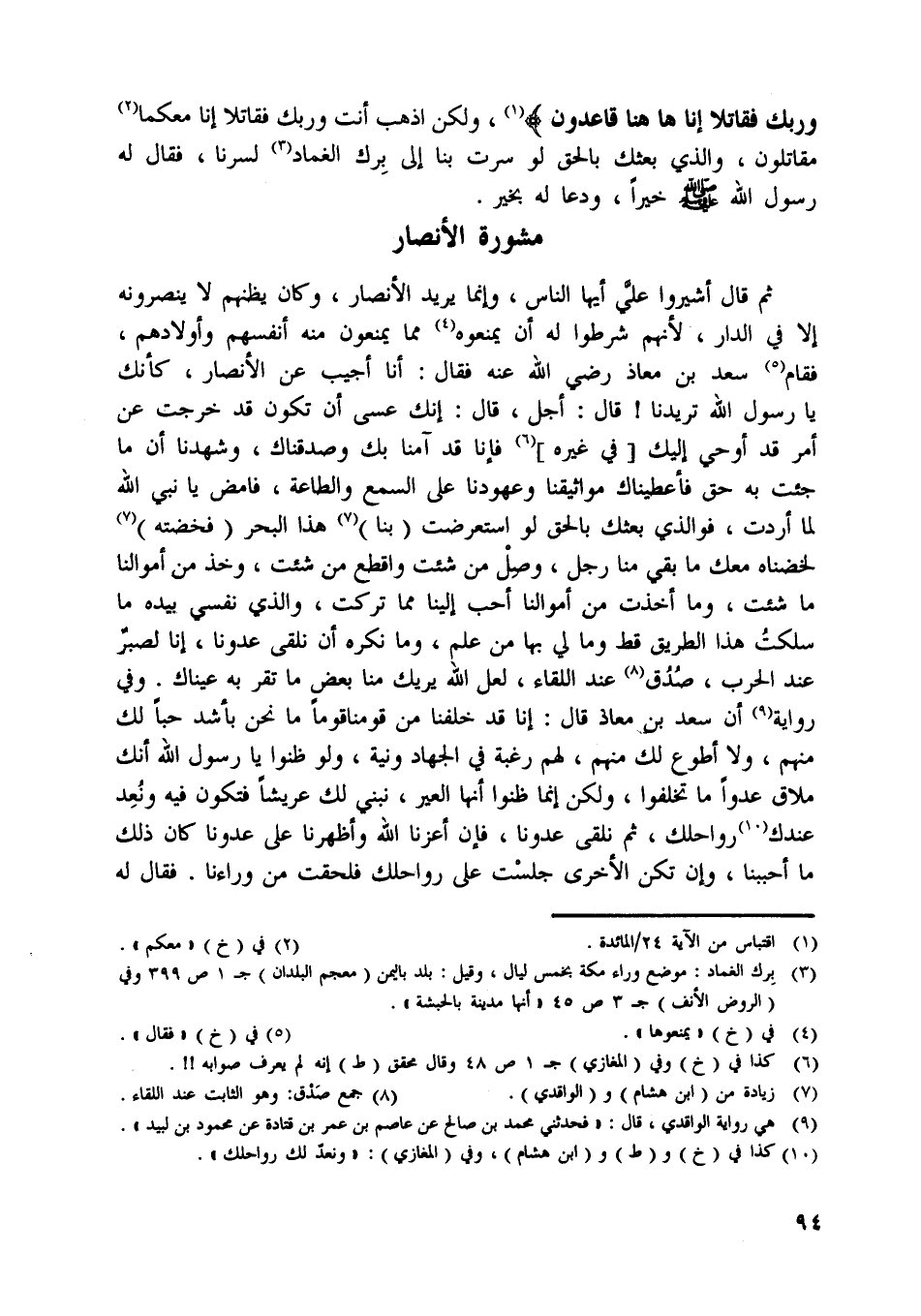 قال أشيروا عليّ أيها الناس، وإنما يريد الأنصار، وكان يظنهم لا ينصرونه إلا في الدار، لأنهم شرطوا له أن يمنعوه [ (4) ] مما يمنعون منه أنفسهم وأولادهم، فقام [ (5) ] سعد بن معاذ رضي اللَّه عنه فقال: أنا أجيب عن الأنصار، كأنك يا رسول اللَّه تريدنا! قال: أجل،