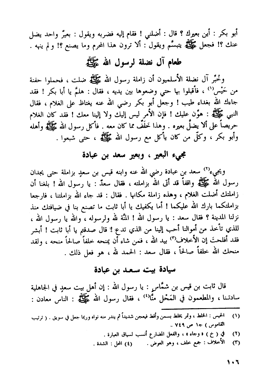 فقال سعد: يا رسول اللَّه! بلغنا أن زاملتك أضلت الغلام، وهذه زاملة مكانها. فقال: قد جاء اللَّه بزاملتنا، فارجعا بزاملتكما بارك اللَّه عليكما! أما يكفيك يا أبا ثابت ما تصنع بنا في ضيافتك منذ نزلنا المدينة؟ فقال سعد: يا رسول اللَّه! المنّة للَّه ولرسوله، واللَّه يا رسول اللَّه، للذي تأخذ من أموالنا أحب إلينا من الّذي تدع! قال صدقتم يا أبا ثابت! أبشر فقد أفلحت إن الأخلاف [ (3) ] بيد اللَّه، فمن شاء أن يمنحه خلفا صالحا منحه، ولقد منحك اللَّه خلفا صالحا، فقال سعد: الحمد للَّه، هو فعل ذلك.