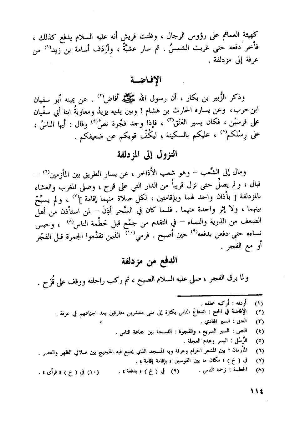 وذكر الزّبير بن بكار، أن رسول اللَّه صلّى اللَّه عليه وسلّم أفاض [ (2) ] . عن يمينه أبو سفيان ابن حرب، وعن يساره الحارث بن هشام! وبين يديه يزيد ومعاوية ابنا أبي سفيان على فرسين، فكان يسير العنق [ (3) ] ،