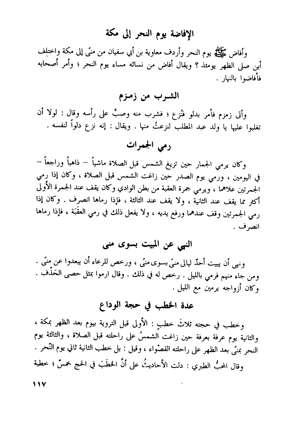 وكان يرمي الجمار حين تزيغ الشمس قبل الصلاة ماشيا- ذاهبا وراجعا- في اليومين، ورمي يوم الصدر حين زاغت الشمس قبل الصلاة، وكان إذا رمي الجمرتين علاهما، ويرمي جمرة العقبة من بطن الوادي وكان يقف عند الجمرة الأولى أكثر مما يقف عند الثانية، ولا يقف عند الثالثة، فإذا رماها انصرف. وكان إذا رمي الجمرتين وقف عندهما ورفع يديه، ولا يفعل ذلك في رمي العقبة، فإذا رماها انصرف.