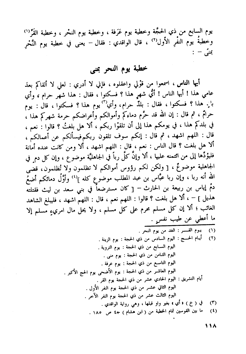 يوم السابع من ذي الحجّة وخطبة يوم عرفة، وخطبة يوم النحر، وخطبة القرّ [ (1) ] وخطبة يوم النفر الأول [ (2) ] ، قال الواقدي: فقال- يعنى في خطبة يوم النّحر بمنى-: