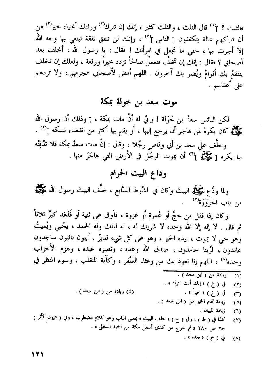 فالثلث؟] [ (1) ] قال الثلث، والثلث كثير، إنك إن تترك [ (2) ] ورثتك أغنياء خير [ (3) ] من أن تتركهم عالة يتكففون [الناس] [ (4) ] ، وإنك لن تنفق نفقة تبتغي بها وجه اللَّه إلا أجرت بها، حتى ما تجعل في امرأتك! فقال: يا رسول اللَّه، أخلف بعد أصحابي؟ فقال: إنك إن تخلف فتعمل صالحا تزدد خيرا ورفعة، ولعلك إن تخلف ينتفع بك أقوام ويضر بك آخرون. اللَّهمّ أمض لأصحابي هجرتهم، ولا تردهم على أعقابهم.