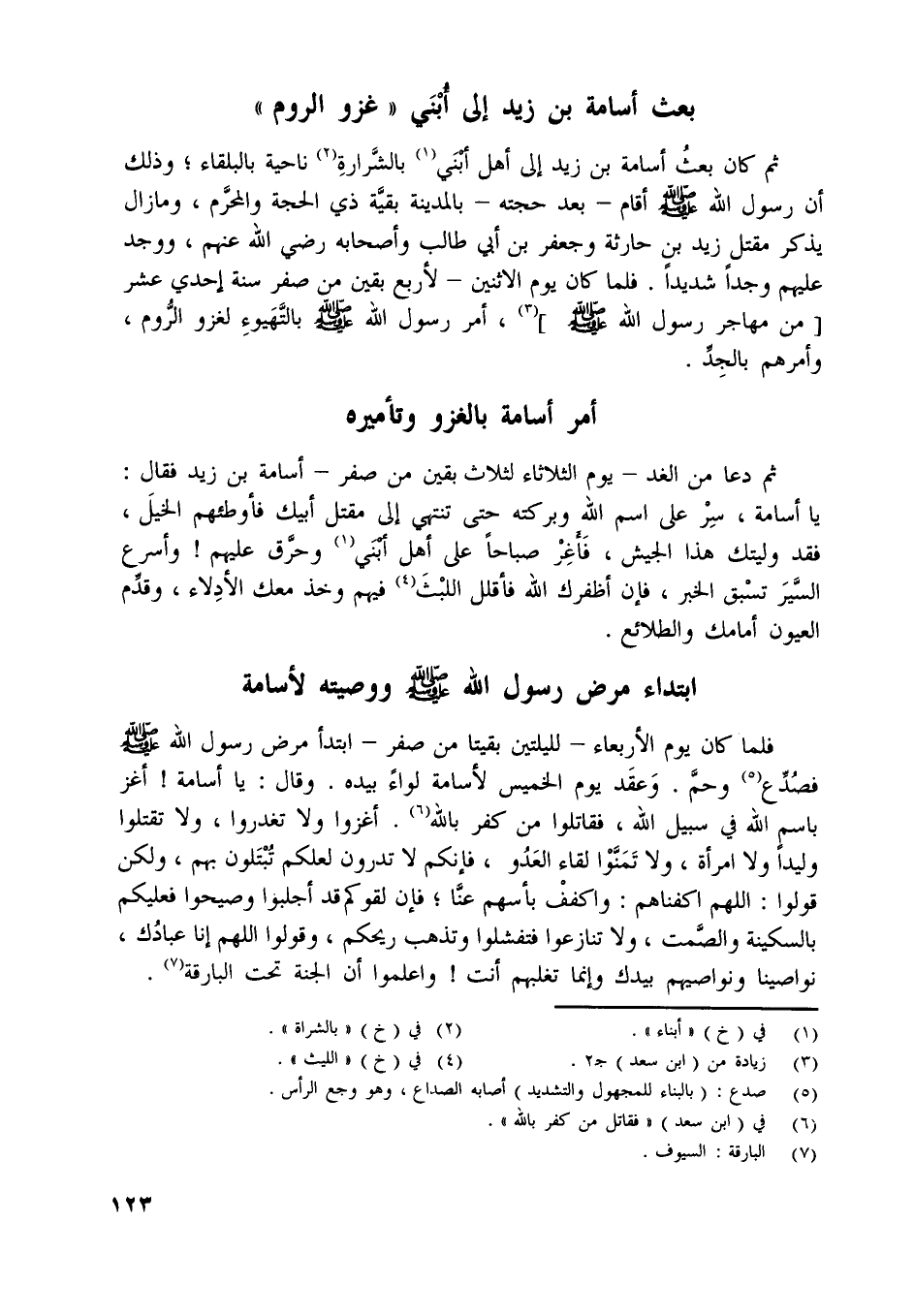 ثم كان بعث أسامة بن زيد إلى أهل أبني [ (1) ] بالشّرارة [ (2) ] ناحية بالبلقاء، وذلك أن رسول اللَّه صلّى اللَّه عليه وسلّم أقام- بعد حجته- بالمدينة بقيّة ذي الحجة والمحرّم، وما زال يذكر مقتل زيد بن حارثة وجعفر بن أبي طالب وأصحابه رضي اللَّه عنهم، ووجد عليهم وجدا شديدا. فلما كان يوم الاثنين- لأربع بقين من صفر سنة إحدى عشر [من مهاجر رسول اللَّه صلّى اللَّه عليه وسلّم] [ (3) ] ، أمر رسول اللَّه صلّى اللَّه عليه وسلّم بالتّهيّؤ لغزو الرّوم، وأمرهم بالجدّ.